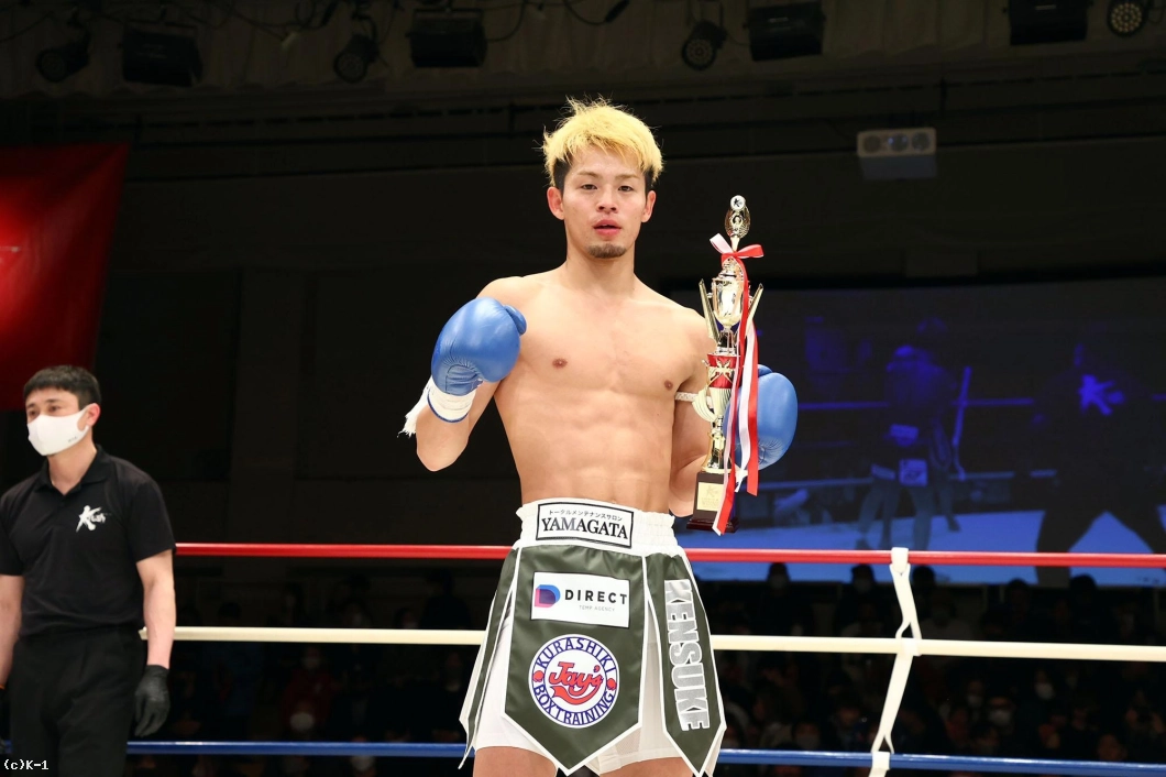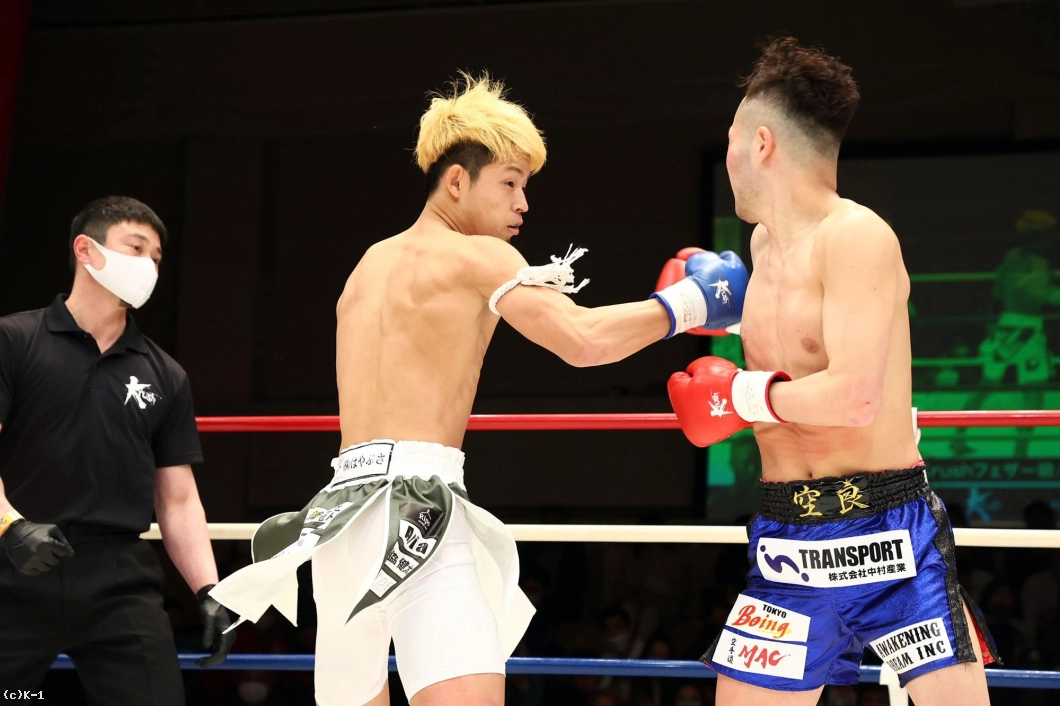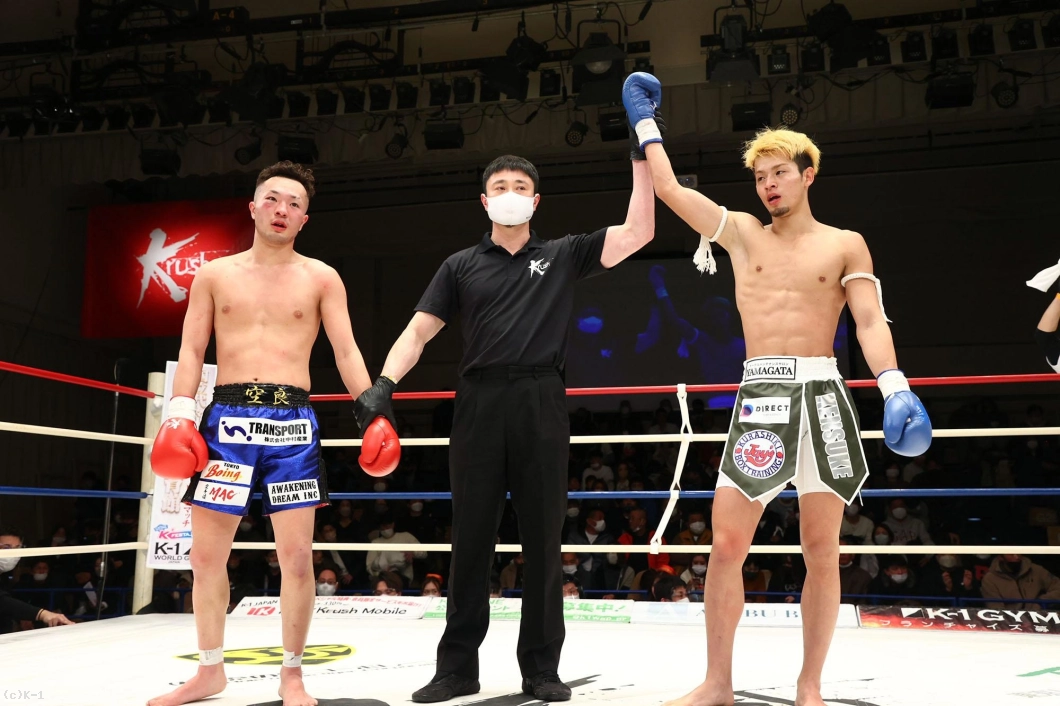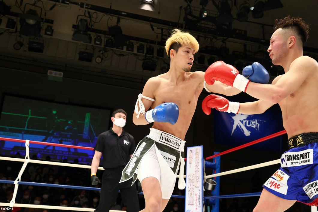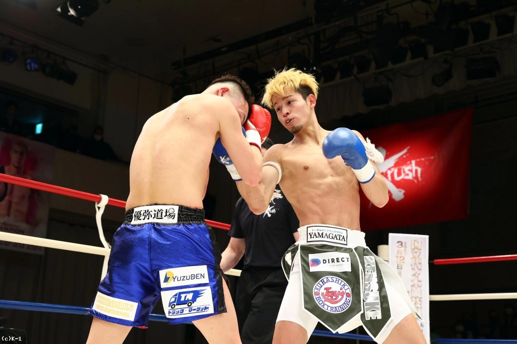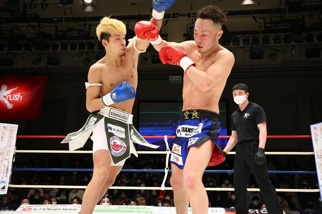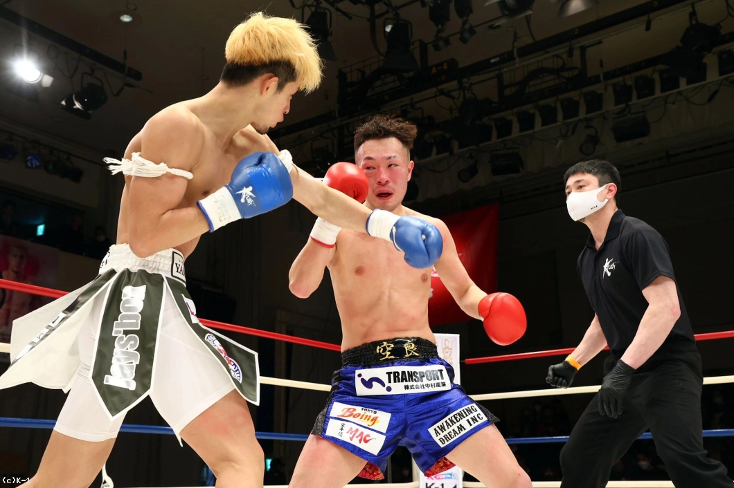 再開。健介は前蹴りで水津を止め、そこから左ストレート、ボディへのヒザとやはり攻勢。水津はダメージと疲労で組みが多くなり注意を受ける。