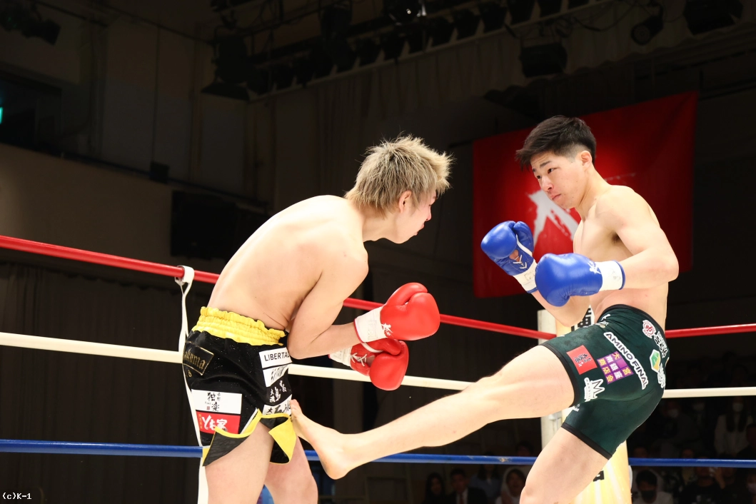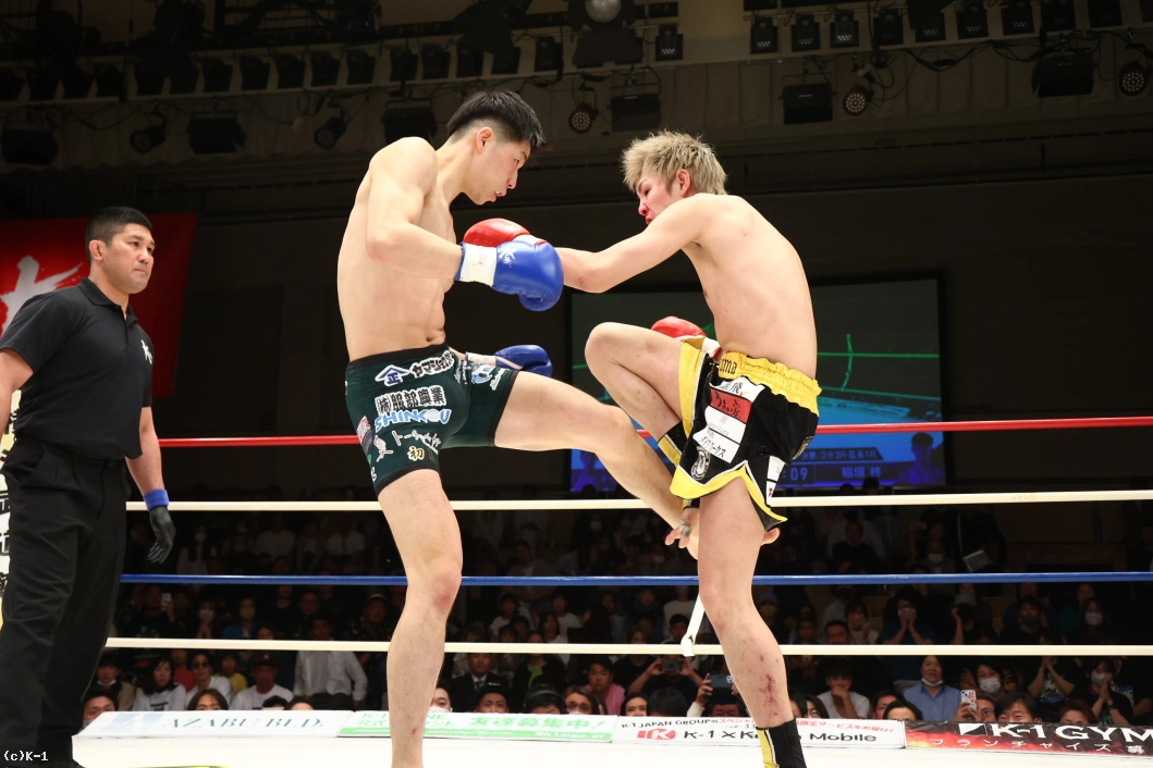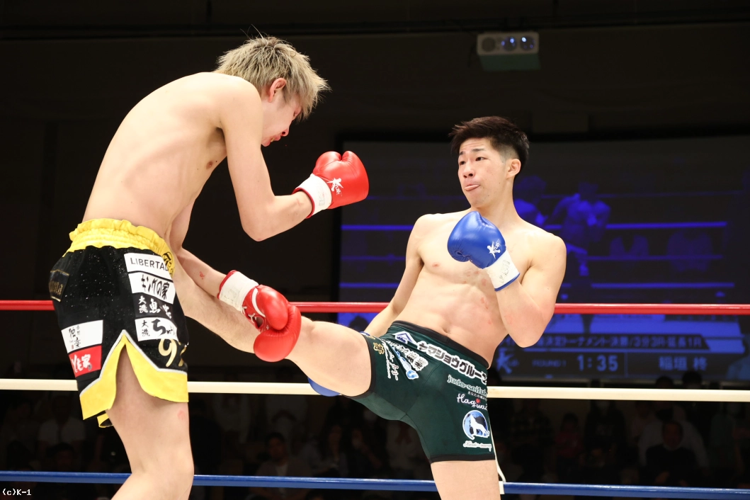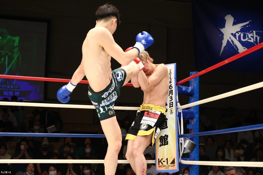1R、塚本が開始から右ミドルを放っていくが、続いてのヒザが稲垣にローブローとなってしまう。再開後、塚本はすぐ右ミドルを蹴り攻めんとするが、稲垣は左ストレートを効かせ左ハイ。さらに右フック、左アッパーと多彩に攻める。左ローを効かせた稲垣は強引には行かず、ボディフックで塚本のガードを落とし、連打をまとめTKO勝ちを収めた。