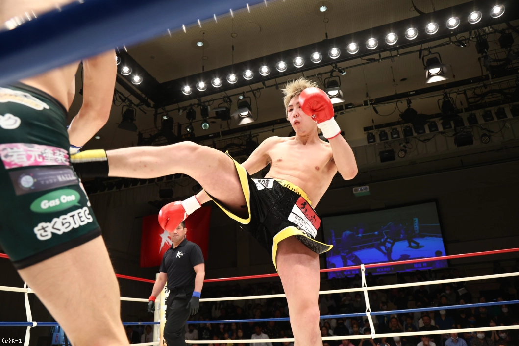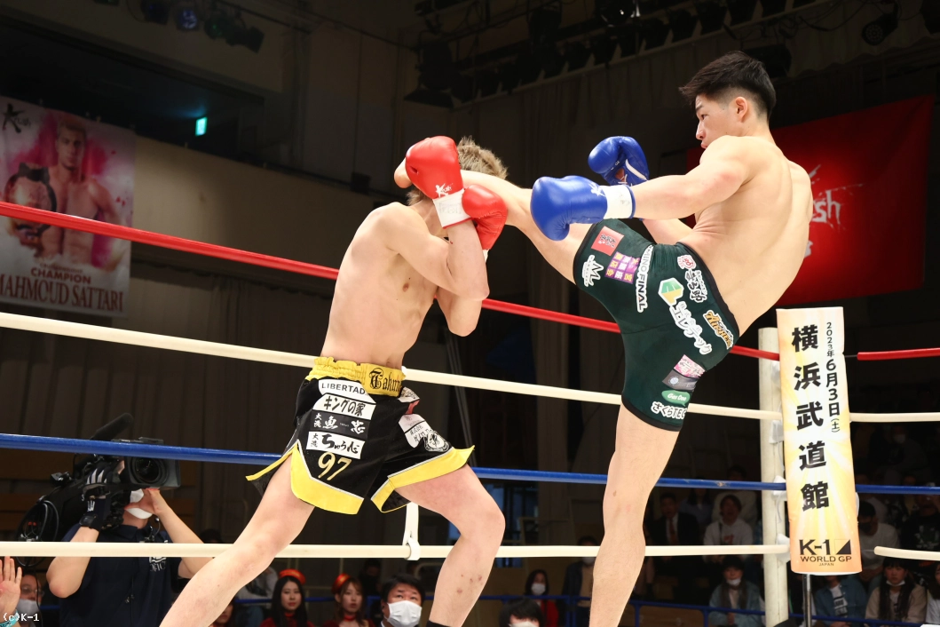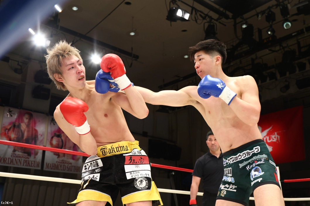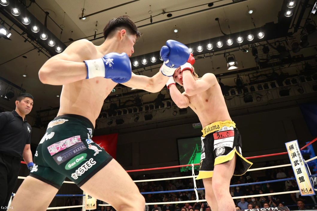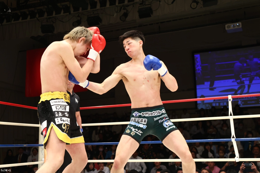 1R、塚本が開始から右ミドルを放っていくが、続いてのヒザが稲垣にローブローとなってしまう。再開後、塚本はすぐ右ミドルを蹴り攻めんとするが、稲垣は左ストレートを効かせ左ハイ。さらに右フック、左アッパーと多彩に攻める。左ローを効かせた稲垣は強引には行かず、ボディフックで塚本のガードを落とし、連打をまとめTKO勝ちを収めた。