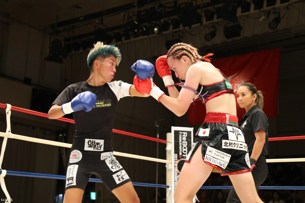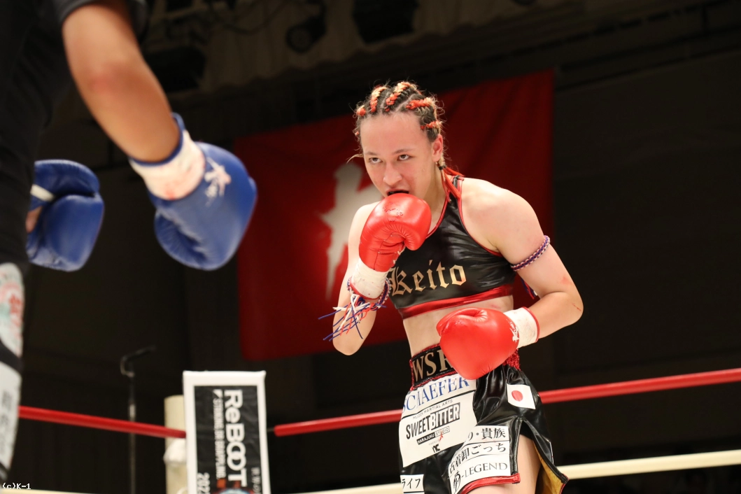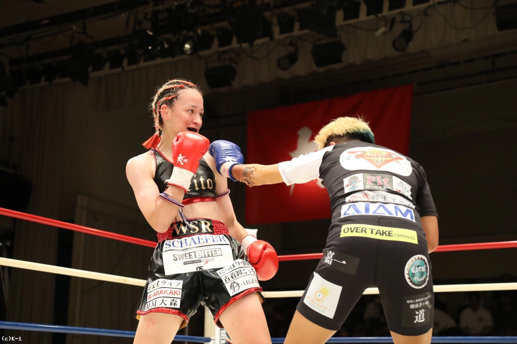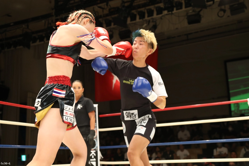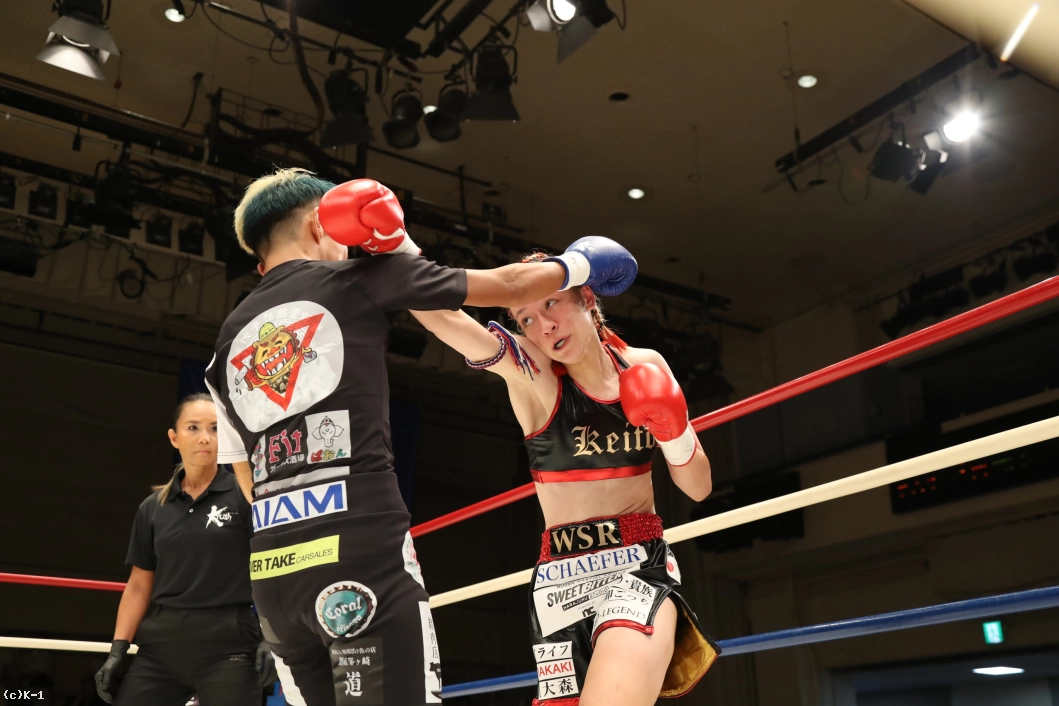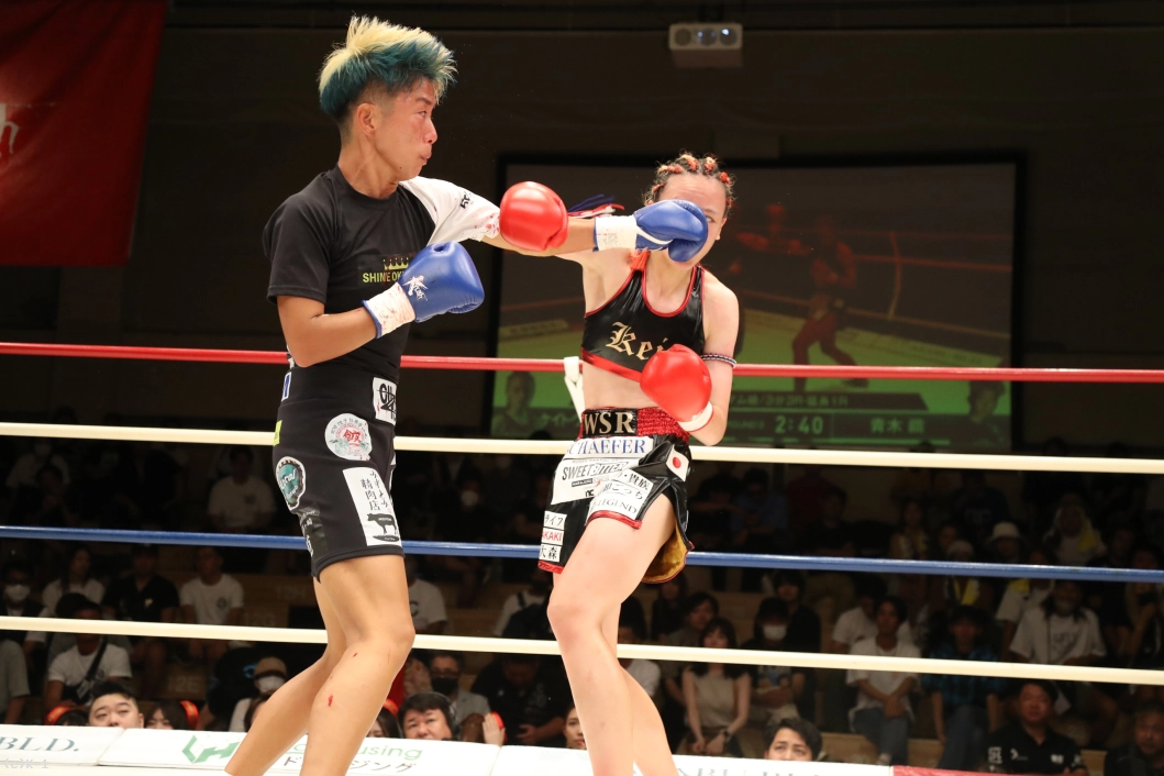 3R、パンチで突進する青木。ケイトはガードを固めてジャブとヒザ蹴りで迎え撃ち、距離が離れると左右のハイキックを狙う。2Rにダウンを奪ったケイトが大差の判定勝利を収めた。