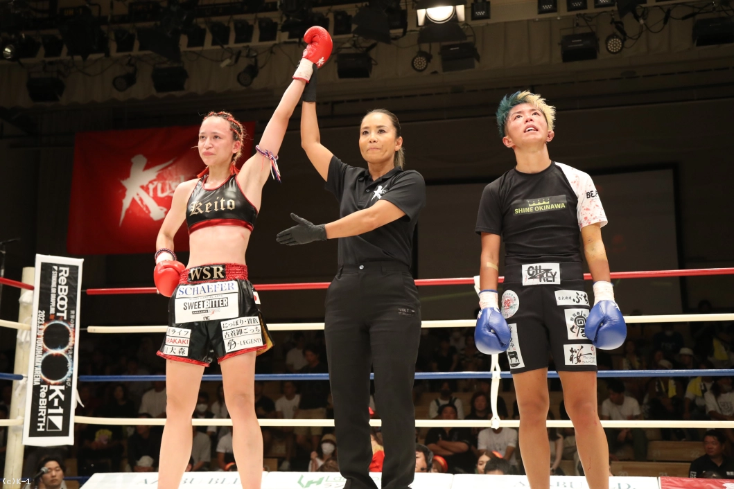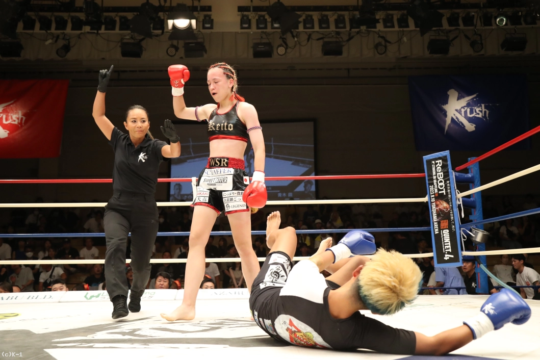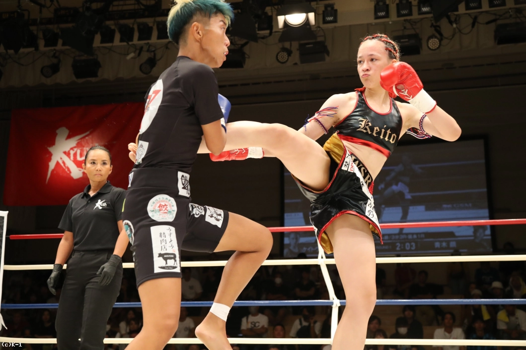2Rも青木が前に出ていくが、ケイトが相打ち気味の右ストレートでダウンを奪う。再開後も青木はパンチで前進。ケイトはジャブを当て、右ミドル・右ローにつなげる。