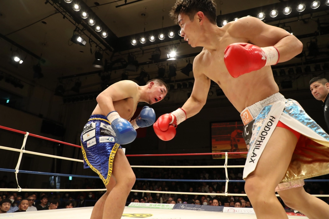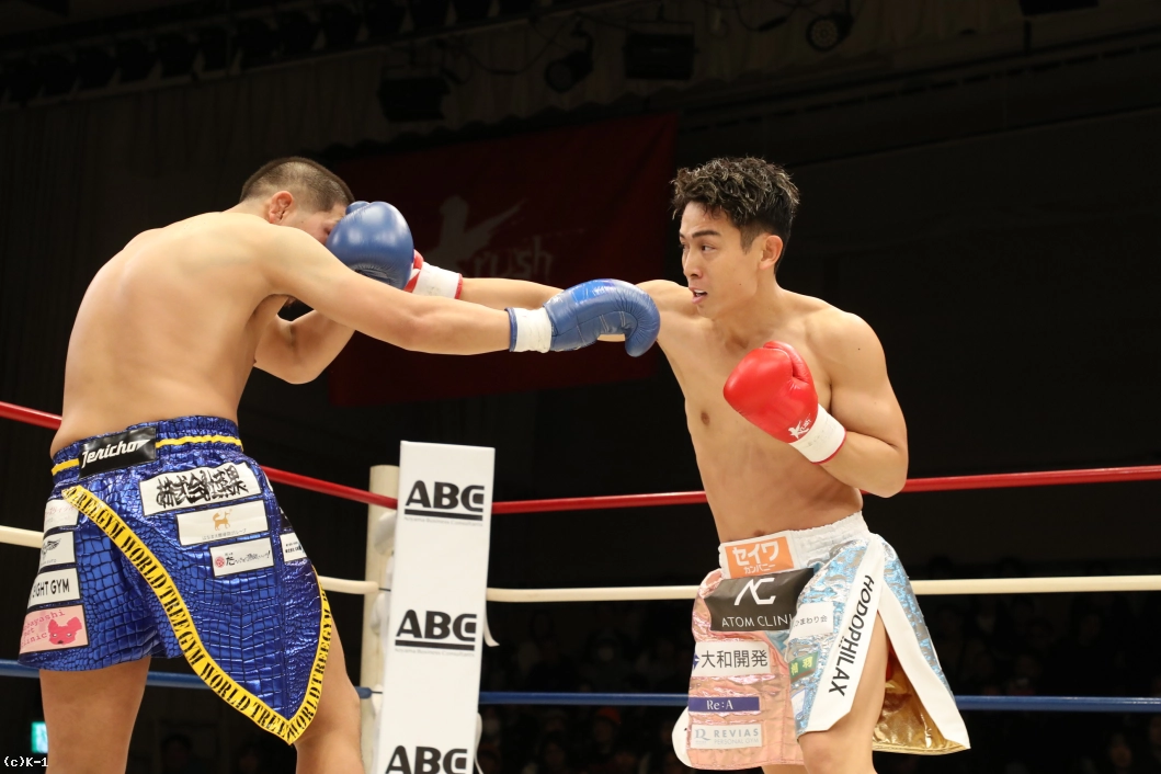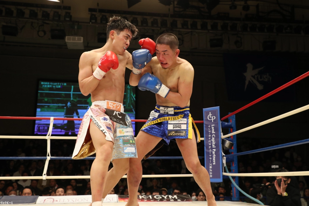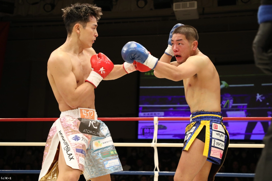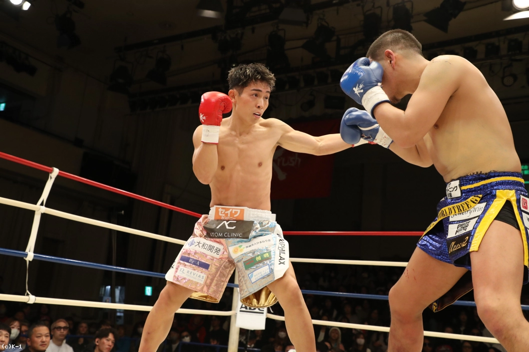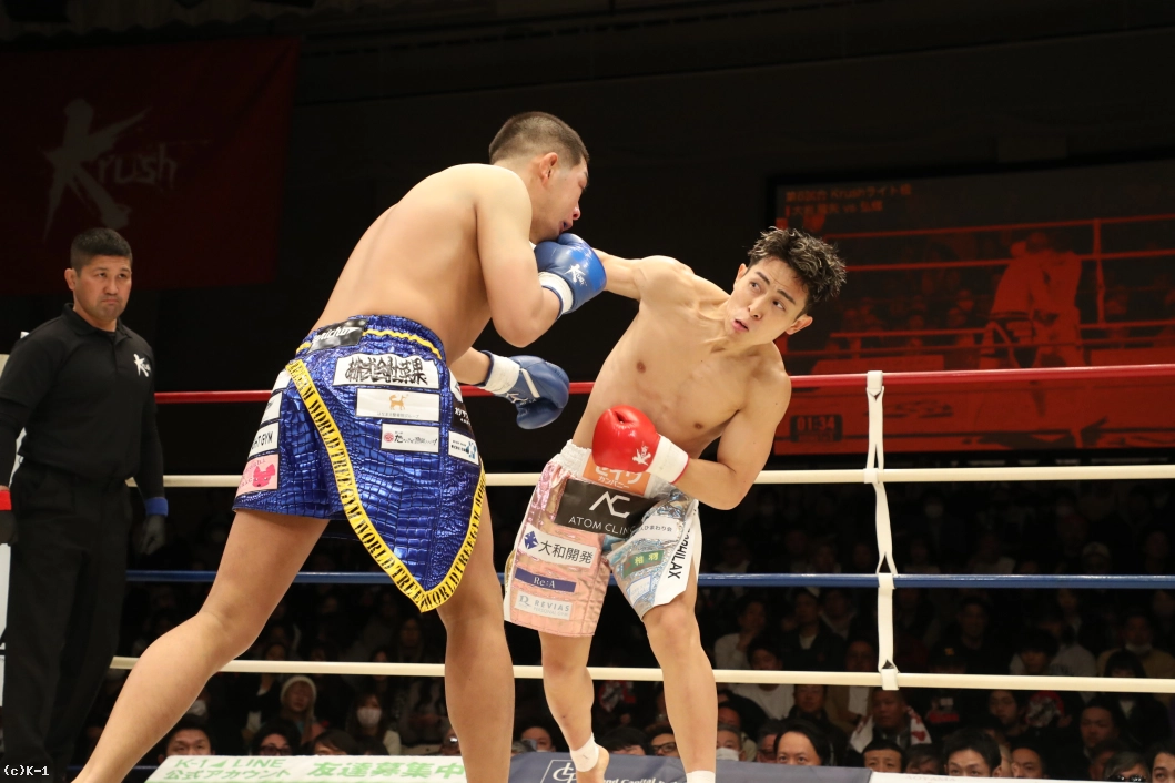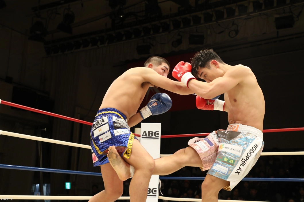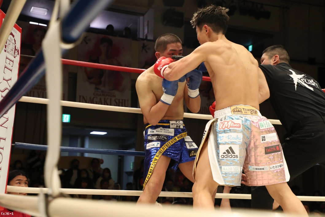 1R、弘輝は細かくジャブを出しながら距離を詰めて左ストレートをぶつけていく。右のボディ、テンカオの膝と攻撃が多彩だ。対する大岩は得意の右のオーバーハンドと、インローへのカーフキックを出していく。弘輝の足が流れる場面が目立ち、カーフキックが効いてきたか。ラウンド終了間際には大岩がラッシュをかけ、右ストレートが弘輝の顔を捉えた。