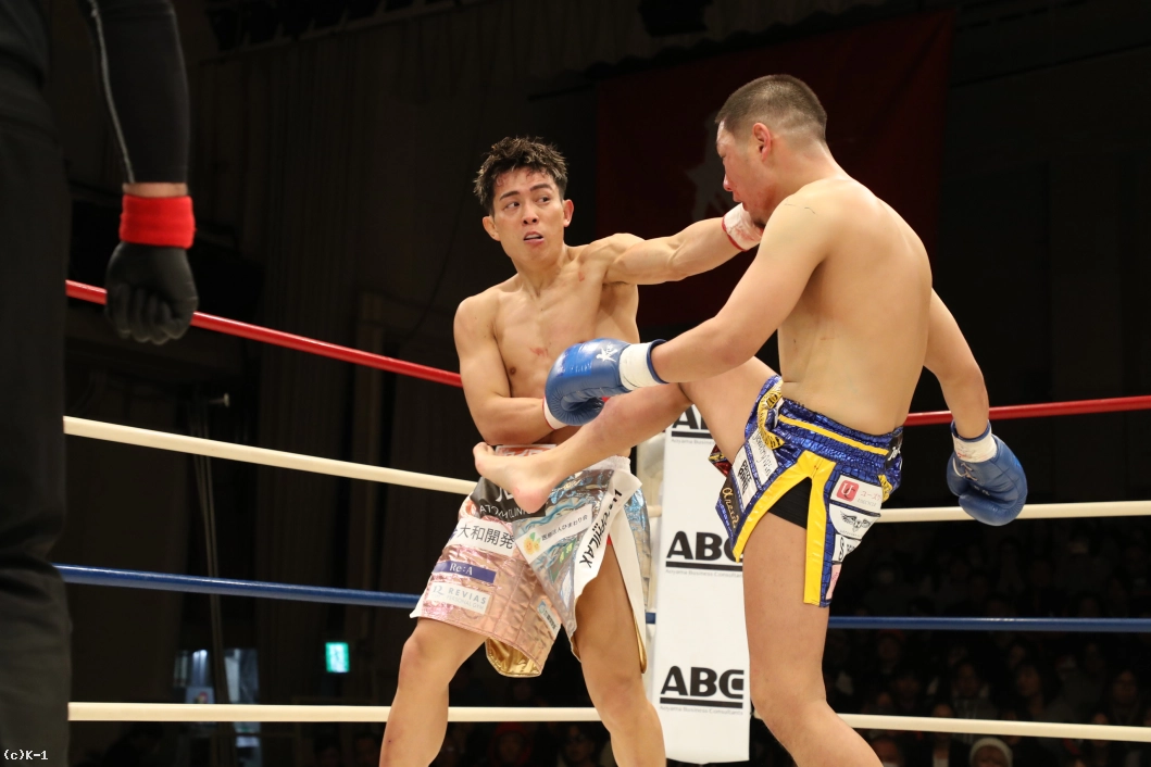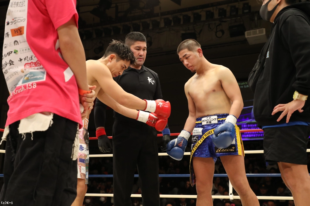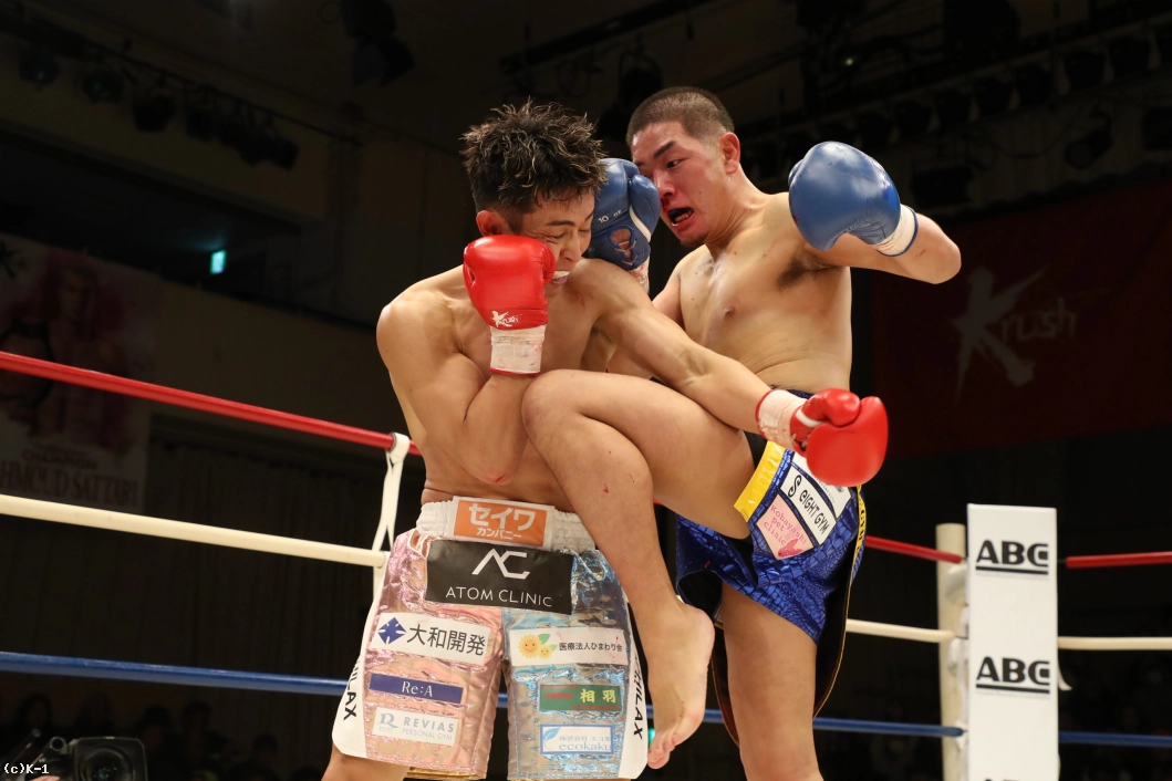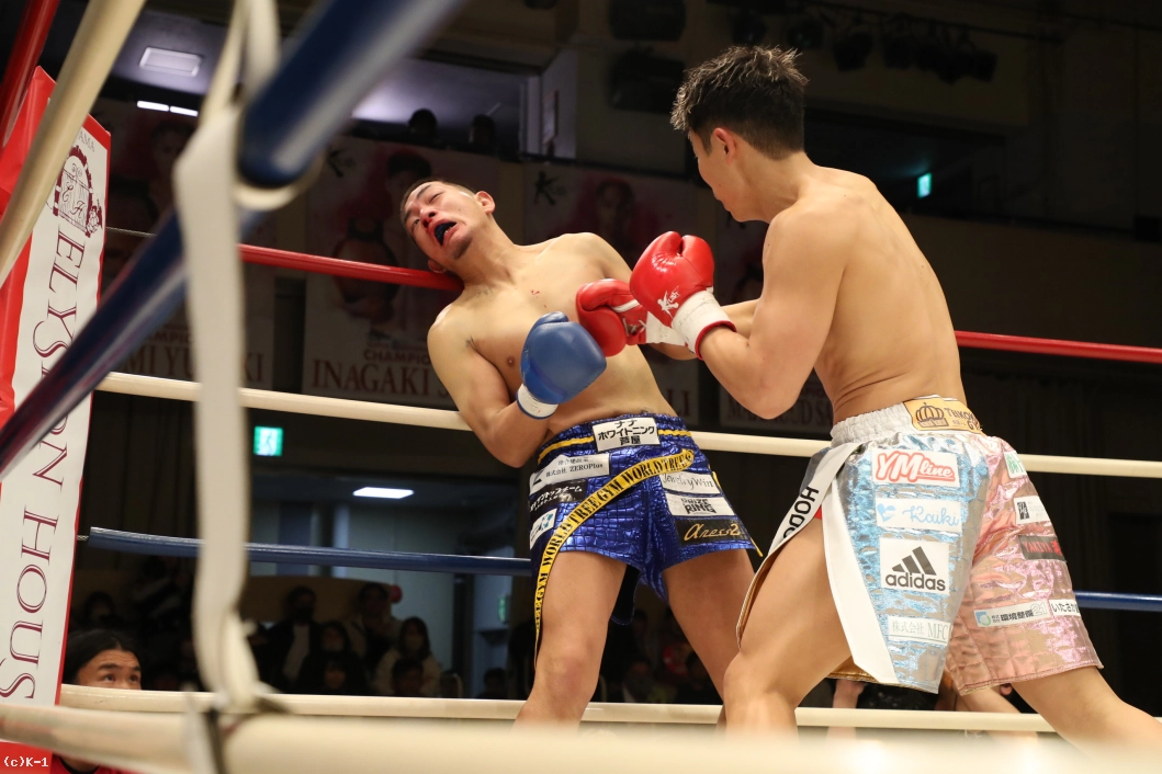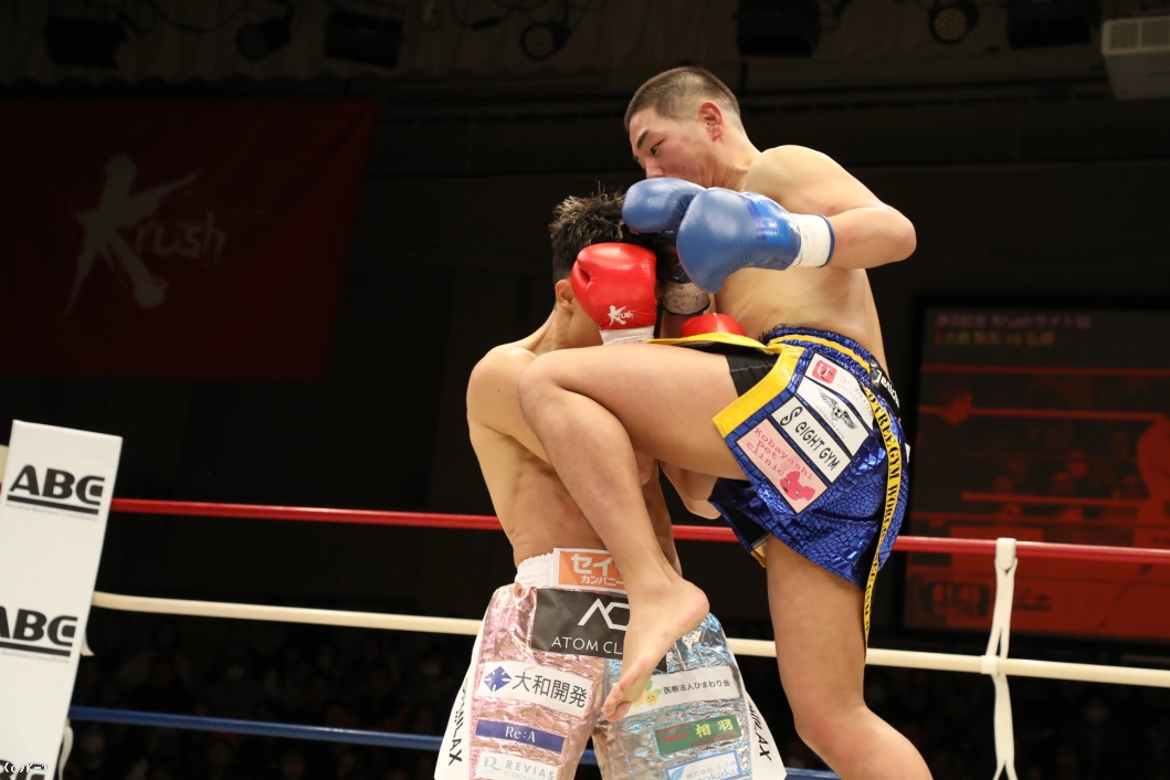 2R、弘輝はパンチのコンビネーションと膝でコツコツと攻撃を当てていく。大岩は1Rで効かせたカーフキックを続けて出していく。嫌がった弘輝はコーナーに後退し、大岩がパンチを連打。弘輝の左膝に大岩が左フックを合わせてダウンを奪った。弘輝は減量がうまくいかなかったこともあるのか、息が上がっている。