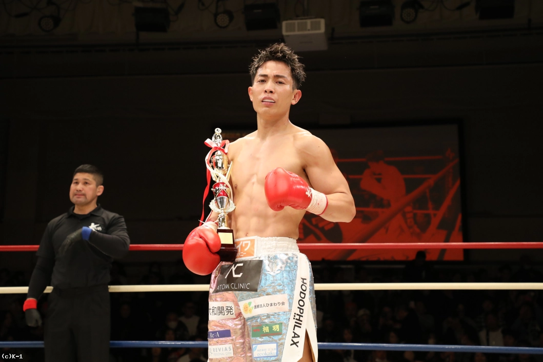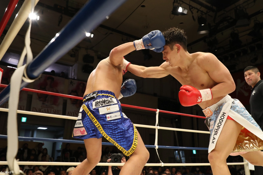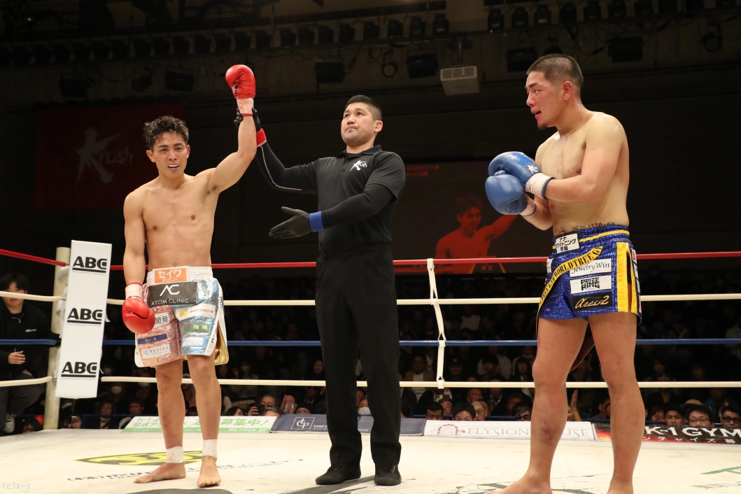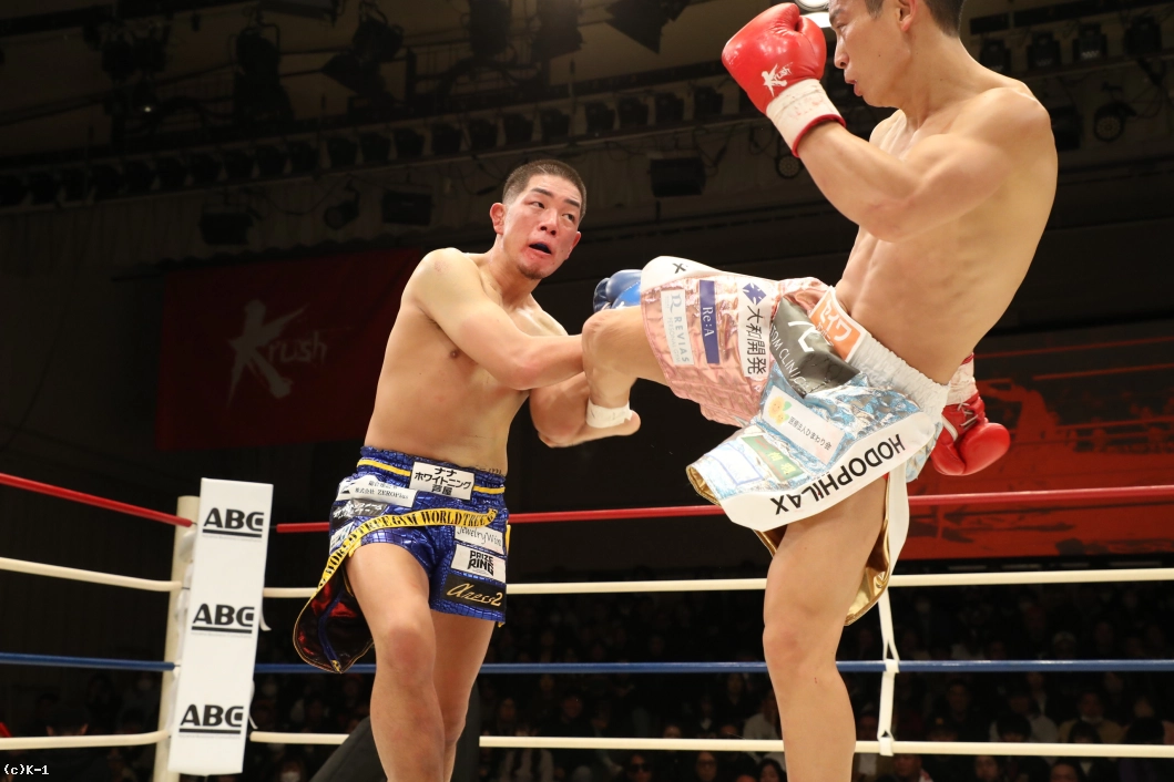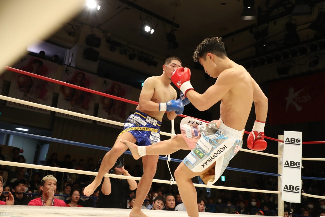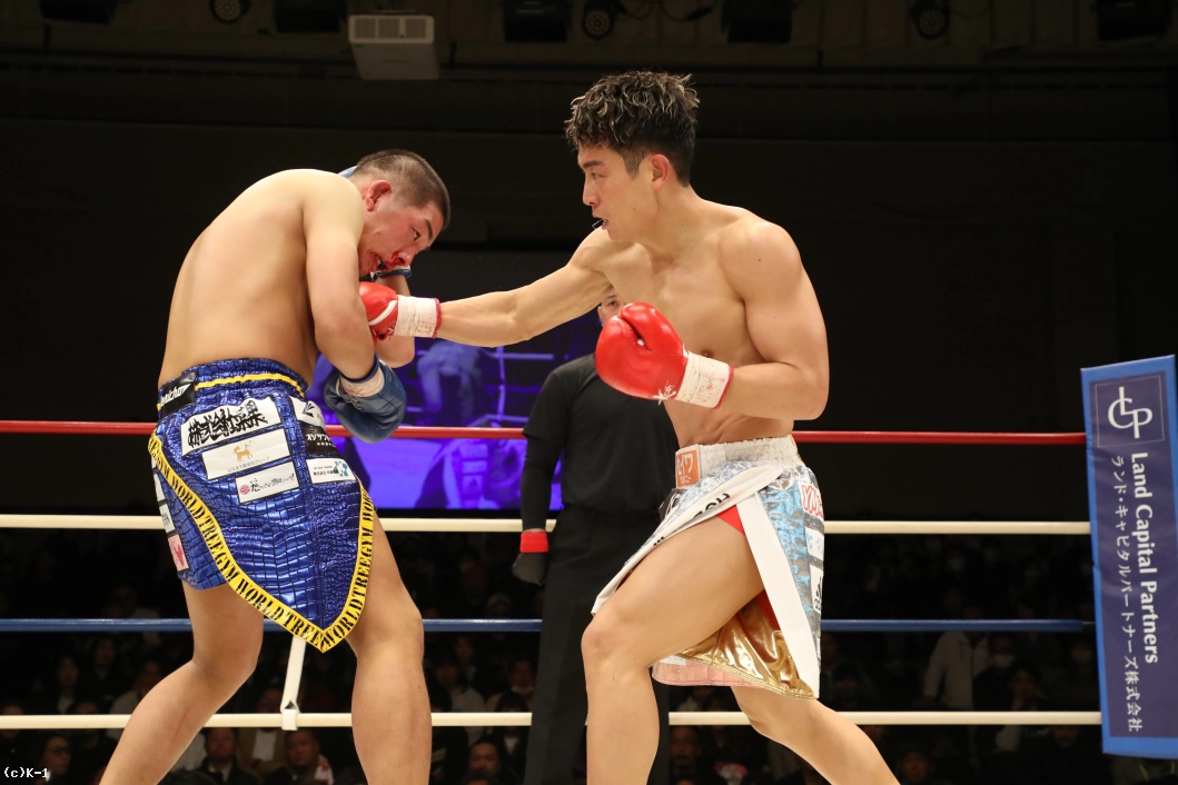 2R、弘輝はパンチのコンビネーションと膝でコツコツと攻撃を当てていく。大岩は1Rで効かせたカーフキックを続けて出していく。嫌がった弘輝はコーナーに後退し、大岩がパンチを連打。弘輝の左膝に大岩が左フックを合わせてダウンを奪った。弘輝は減量がうまくいかなかったこともあるのか、息が上がっている。