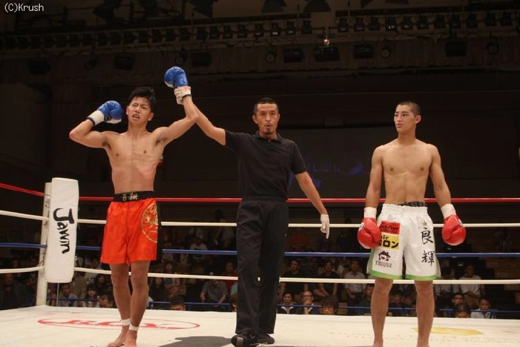 3R、亀本がガードを上げてヒザ蹴りで前に出る。良輝は亀本を突き離してパンチを打とうとするが、亀本の前進は止まらない。良輝は前蹴りから右ハイキックを狙うが、亀本もヒザ蹴りで応戦。大きな差がないまま試合終了となったが、判定は亀本に軍配が挙がった。