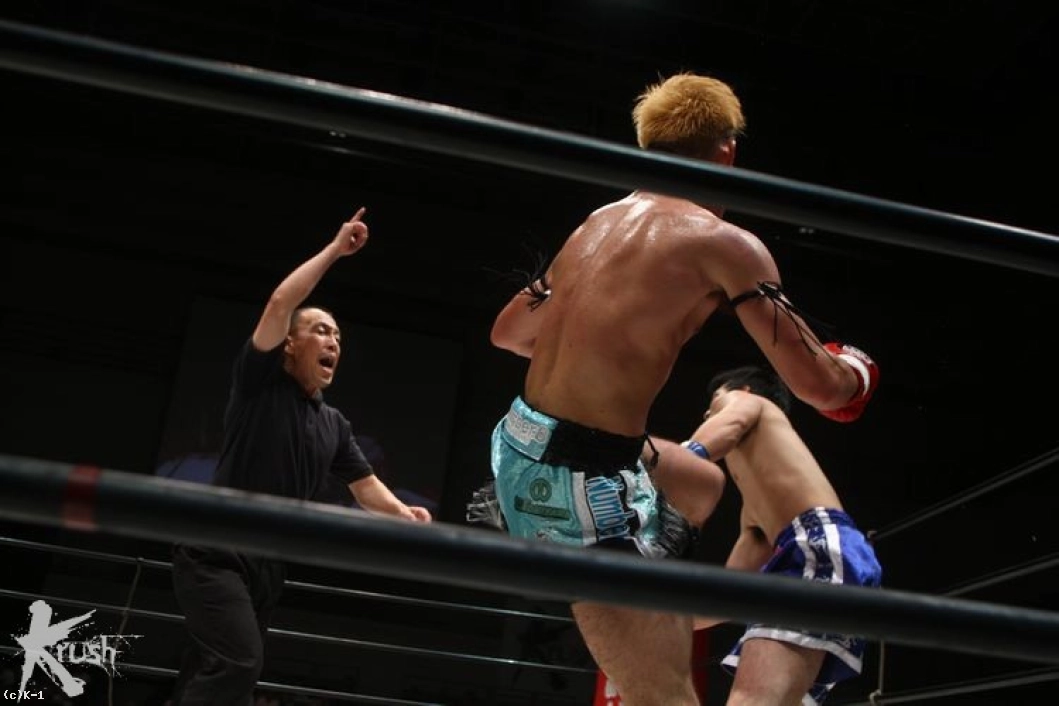 そして2R開始早々、上田の右ローで前田がダウン。何とか立ち上がる前田だったが、上田がローを集中砲火。これで前田を蹴り倒し、上田が見事なKO勝利でデビュー戦を飾った。