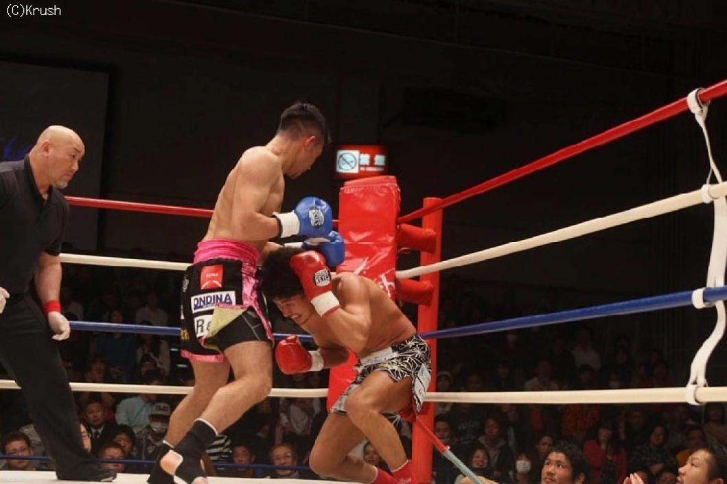 2R、神戸が細かくフェイントを入れて左右のフック、右ストレートをヒットさせるとパンチとヒザ蹴りで前に出る。北井も必死にパンチを返すが、神戸が右フックを当てて前進。左ボディ・左フックを効かせ、下がる北井にパンチをまとめてダウンを奪う。再開後、神戸はすぐに顔面とボディにパンチをまとめてダウンを追加。北井も何とか立ち上がったが、神戸が強烈なボディブローからパンチをまとめて北井をなぎ倒した。