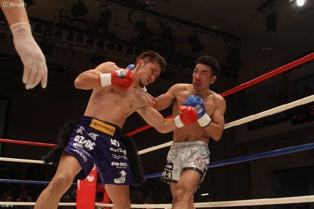 3R、二人の右ストレートと左フックが激しく交錯。一気に火が点いたように両者が打ち合う。距離を取ったNOMANは左ミドルを蹴るが、寺崎が構わず前に出て右ストレート、バックブロー、ヒザ蹴りと手数を増やす。パワーと攻撃力を活かして前に出る寺崎。NOMANは下がりながらも左フックを当てて、必死に打ち合う。その後も両者は休むことなくノンストップの打ち合いを展開。会場が大きな盛り上がりを見せたまま、試合終了のゴングが鳴らされた。運命の判定は2-0でNOMANが勝利。盟友対決を制したNOMANが第3代Krush-65kg級王座に就いた。