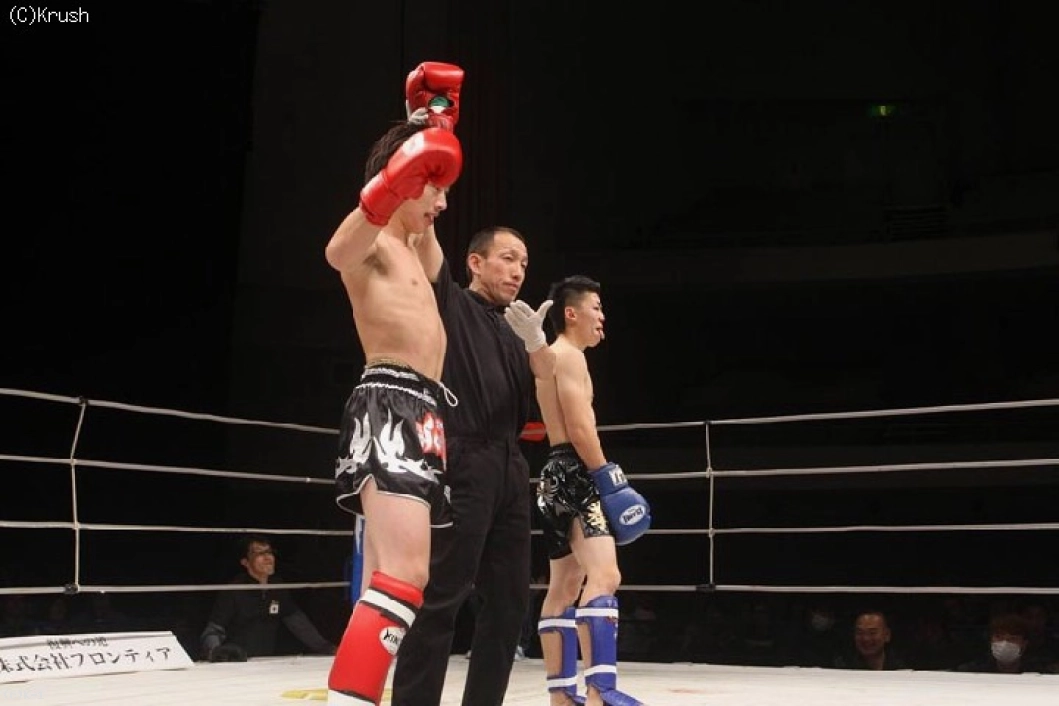 1R、サウスポーの倉持が距離を取り、そこに内田がパンチで飛び込む。パンチの打ち合いになると倉持が左のパンチでダウンを奪い、再開後もヒザ蹴りで攻め込む。2Rもミドルとヒザ蹴りで攻める倉持。終盤、やや動きが止まり、内田がパンチで攻め込んだが、倉持が判定勝利を収めた。