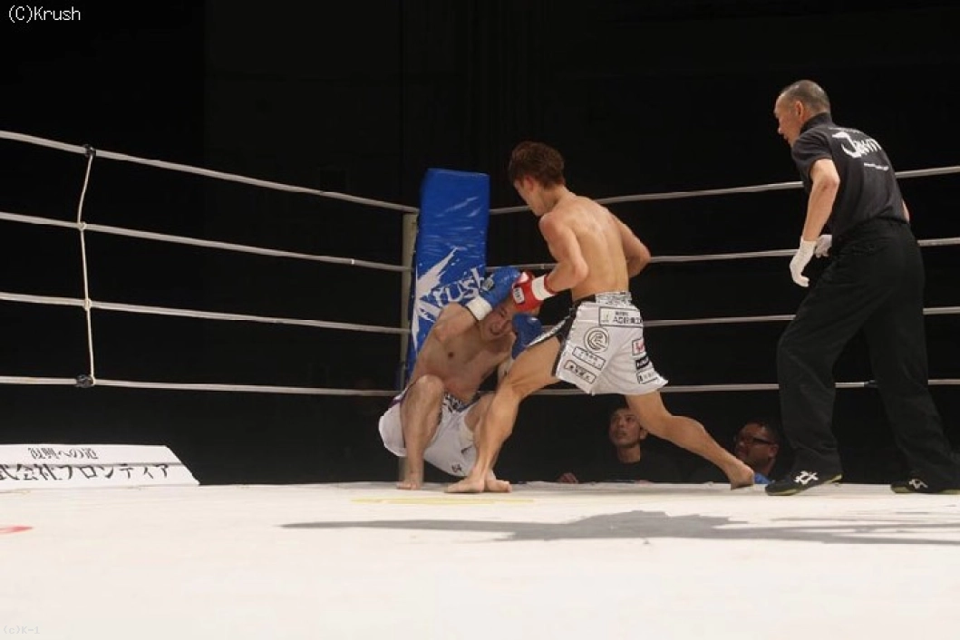 緒方も左ストレートを返すが、野杁は下がらない。野杁のインローがローブローとなり、一時試合が中断となるが、再開後、野杁がボディへのヒザ蹴りから一気にラッシュ。最後は右ストレートを打ち抜いて、緒方からダウンを奪う。立ち上がる緒方だったがカウント内にファイティングポーズを取ることが出来ず、野杁がKO勝利で自らの再起戦とKrushの2014年ラストマッチをKOで飾った。