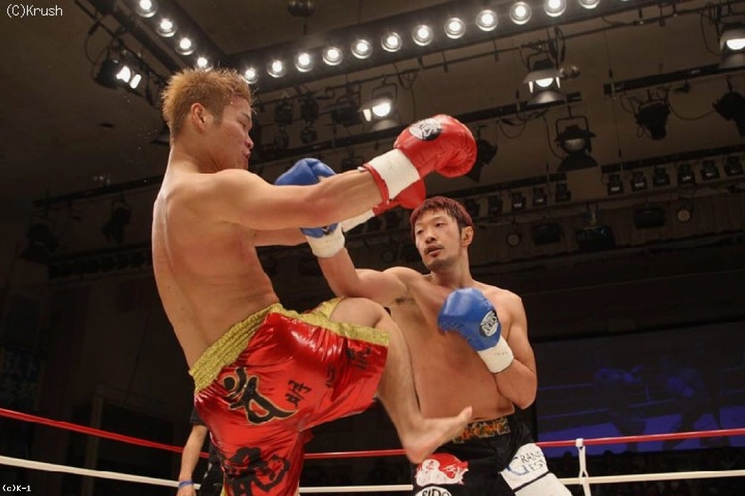 1R、サウスポーの原田が右のアウトローと左の前蹴り。翔也もじりじりと前に出ていくが、原田は左ミドルと左ストレート、ジャブをヒットさせる。飛び込むように右ストレートを打つ原田。翔也も返しの左フックを狙い、ガードを上げて距離を潰して左フックを強振する。