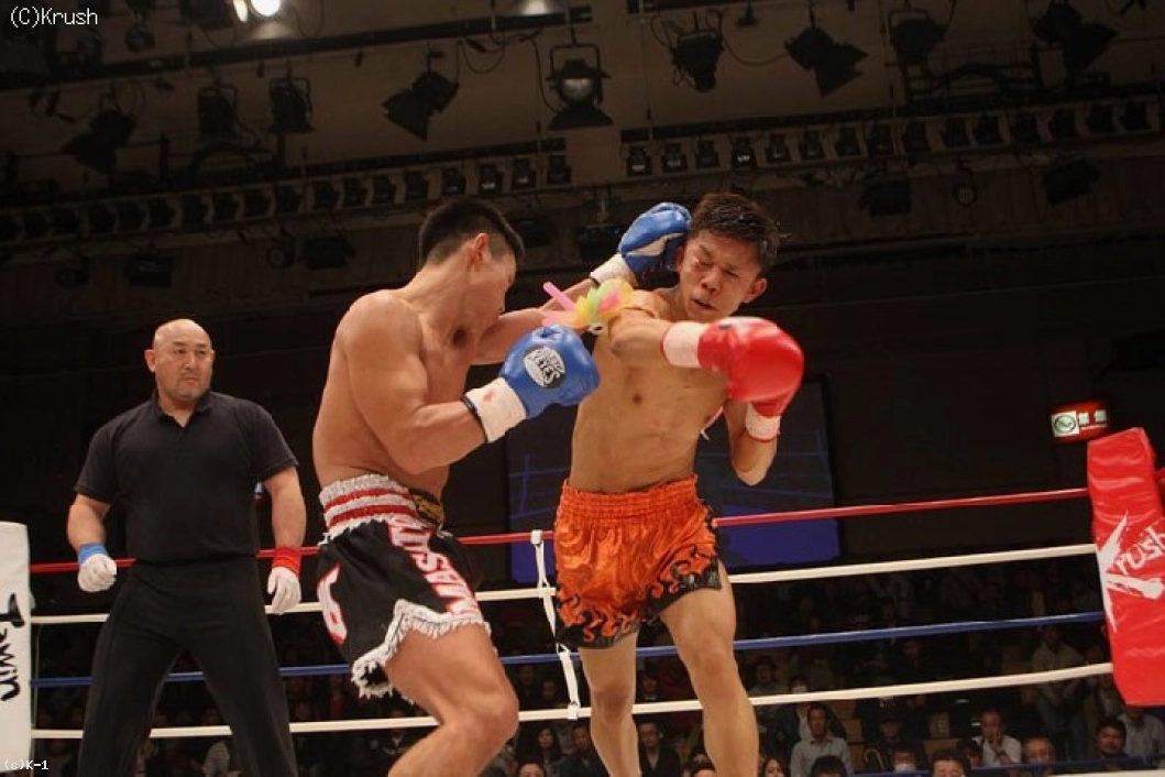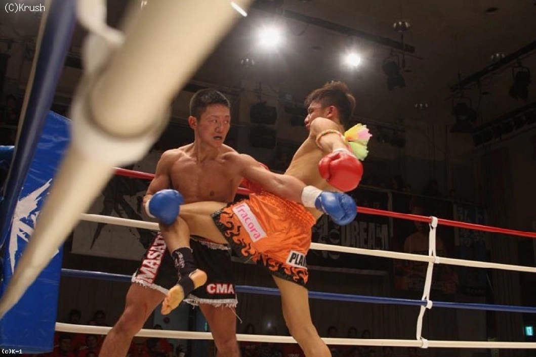 2R始まってすぐ、鼻から出血する堀尾にドクターチェックが入る。再開後、堀尾は前蹴りと右ロー、結城も左フックから飛び込んでパンチをまとめる。ここで堀尾が右ストレートを打ち抜き、左ボディとヒザ蹴りから一気に連打。結城もパンチを打ち返すが、堀尾が右フックと右ストレートでコーナーにくぎ付けにする。
