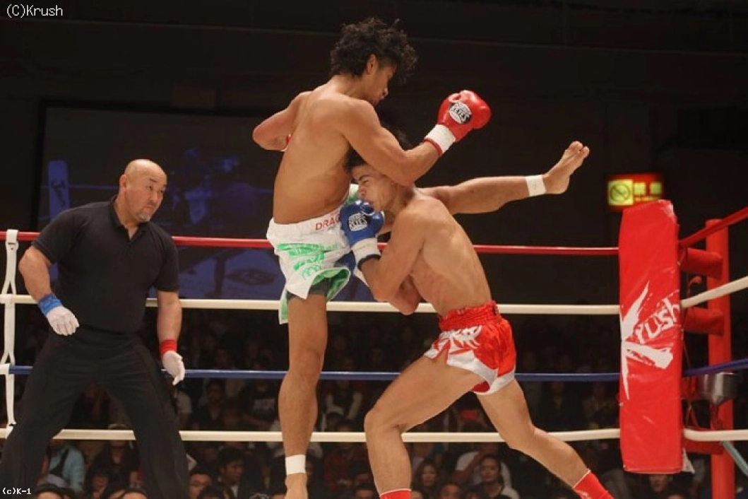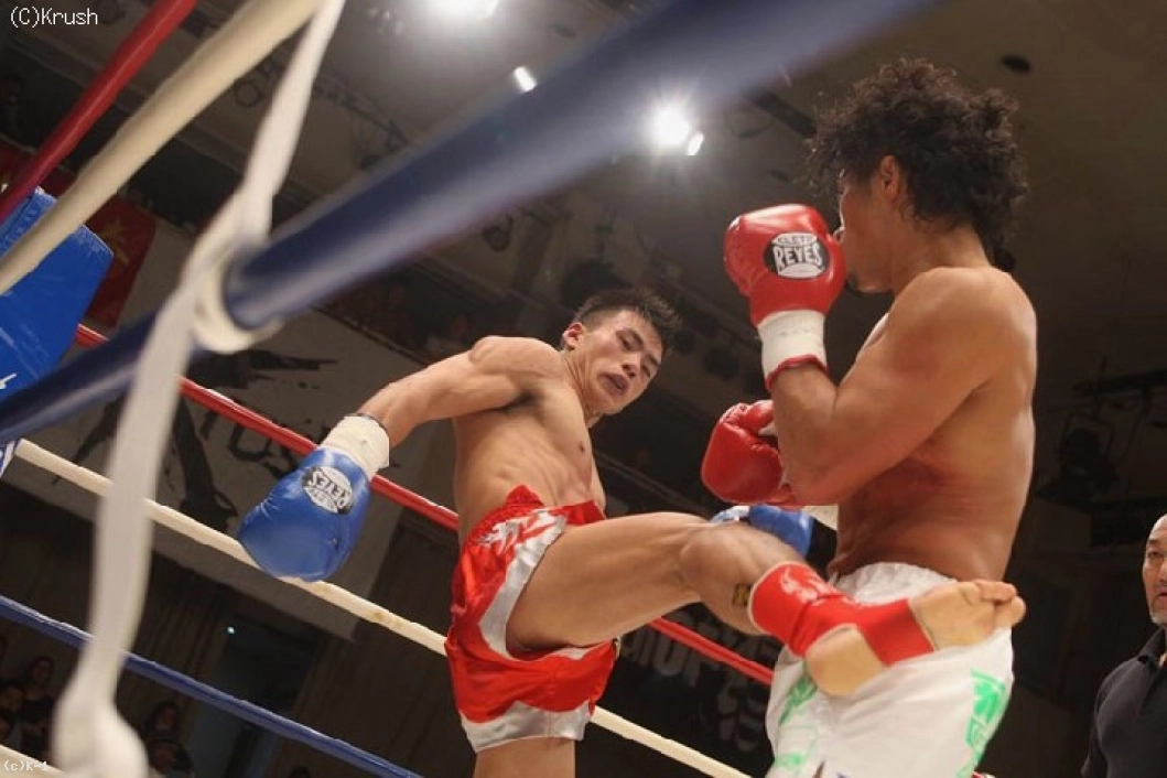 2R、グィシャンが右ストレートと右ミドル。功也は左の前蹴りでボディを狙い、右ハイキック・左のヒザ蹴りで攻め込む。手数を増やして前に出る功也だったが、タフなグィシャンは下がらず前に出てくる。功也も手数を休めることなく攻め続け、右ハイキックから一気に連打。しかしグィシャンも右フックを強振して譲らない。