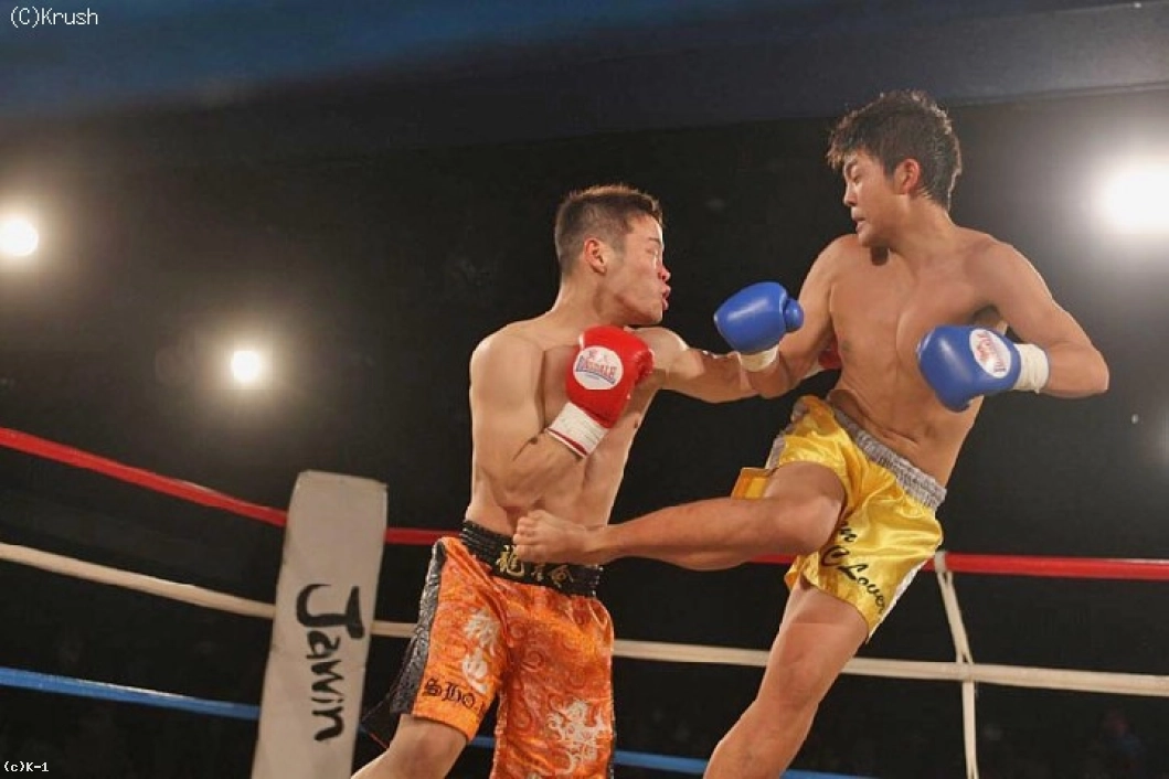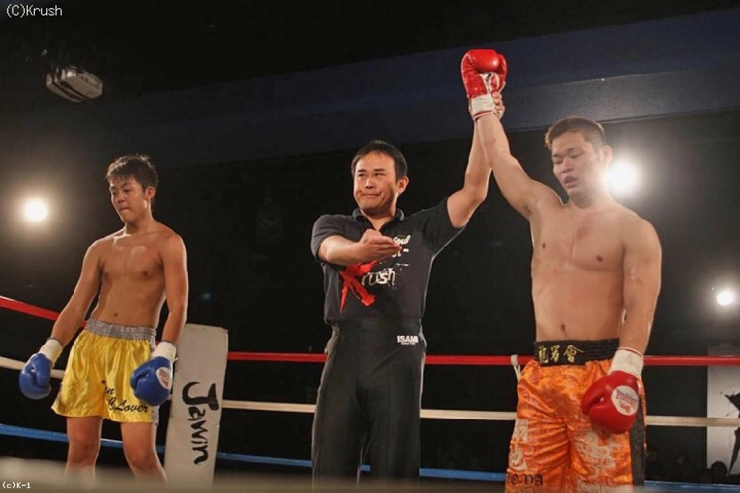 3R、左フックから前に出る翔也が顔面とボディにバックキック。翔也がパンチで飛び込むと竹内は飛びヒザ蹴りを返す。竹内は右ローと右ハイキック、翔也は左フックを連打。翔也が左ストレートから突進し、竹内が右ハイキックを蹴ったところで試合終了。1Rにダウンを奪った翔也が判定勝利を収めた。