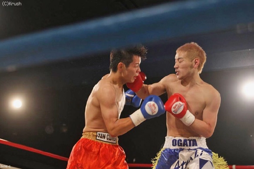 3R、サウスポーに構えた岩崎が右フックから前に出る。下がる緒方に右ミドルと右ハイキックを当てるが、タフな緒方は倒れない。残り30秒、緒方をコーナーに詰めて左ストレートと右フックを叩き込む岩崎だったが、緒方を倒しきれない。