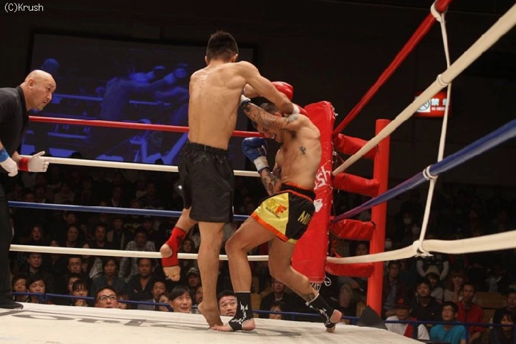 1R、サウスポーの板橋がインローと奥足ロー。これがローブローとなり試合が一時中断となる。再開後、板橋は左右のロー、トッチは右ストレートを返す。板橋は左ストレートを返し、奥足ローを狙い撃ち。そして左ストレートでダウンを奪う。