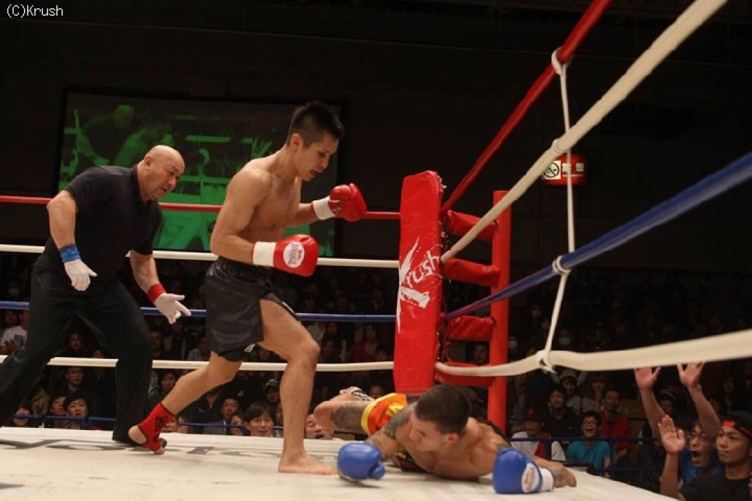 トッチも何とか立ち上がったが、再開後、板橋は左ボディから顔面に連打をまとめてダウンを追加。最後は左のヒザ蹴りでトッチをマットに沈めた。王者としてきっちりKO勝利を収めた板橋だったが「ちょっと自分の中ではもう少しやりたかったんですけど…次、次に期待してください」と締めた。