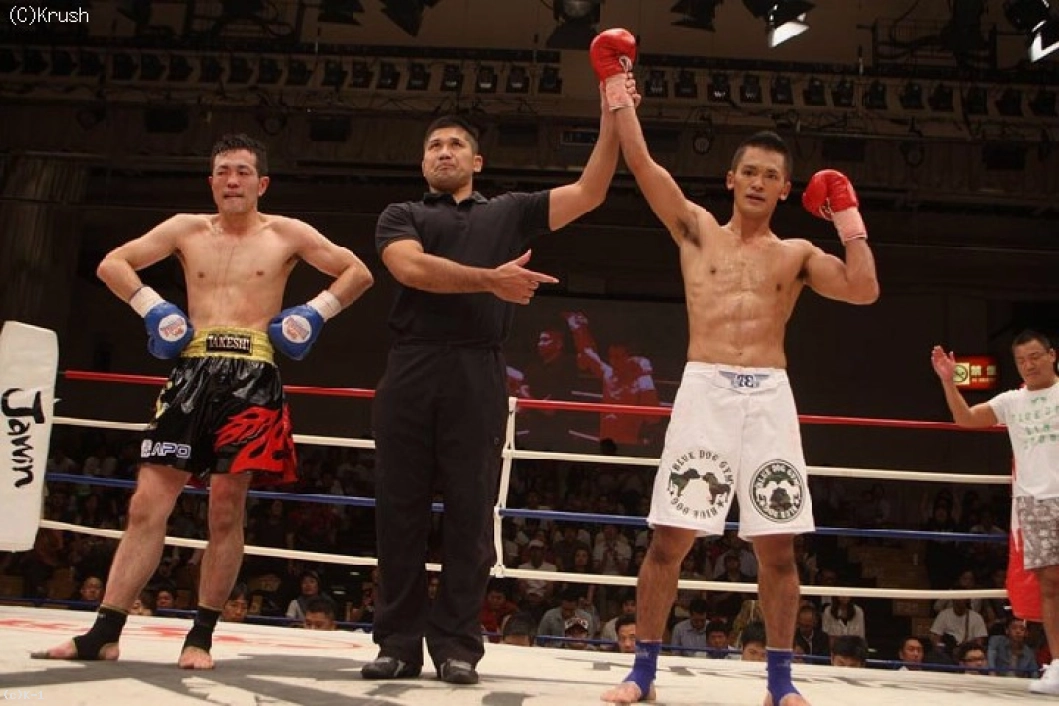 再開後、先にパンチで出ていくのは渡辺。後藤のローに左ックを合わせる。後藤もジャブを突いて右フック、左ローと左ミドルを当てる。最後まで打ち合う両者だったが、判定は後藤に軍配が上がった。