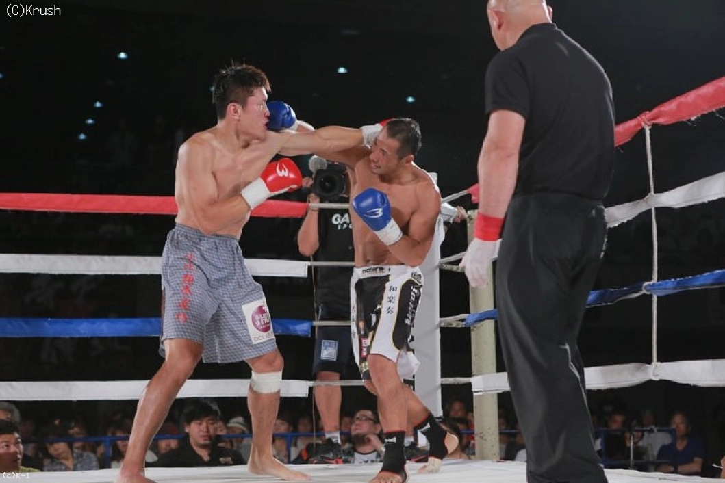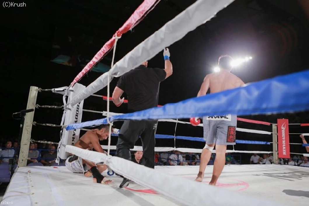 2R、藤田が藤井をロープに詰めてローを連打。何とか立ち続ける藤井だったが、コーナーに体を預けるようにしてスタンディングダウンを宣告される。再開後、藤田はすぐにローを飛ばしてパンチから右ハイキック。この一発でKO勝利を収めた。