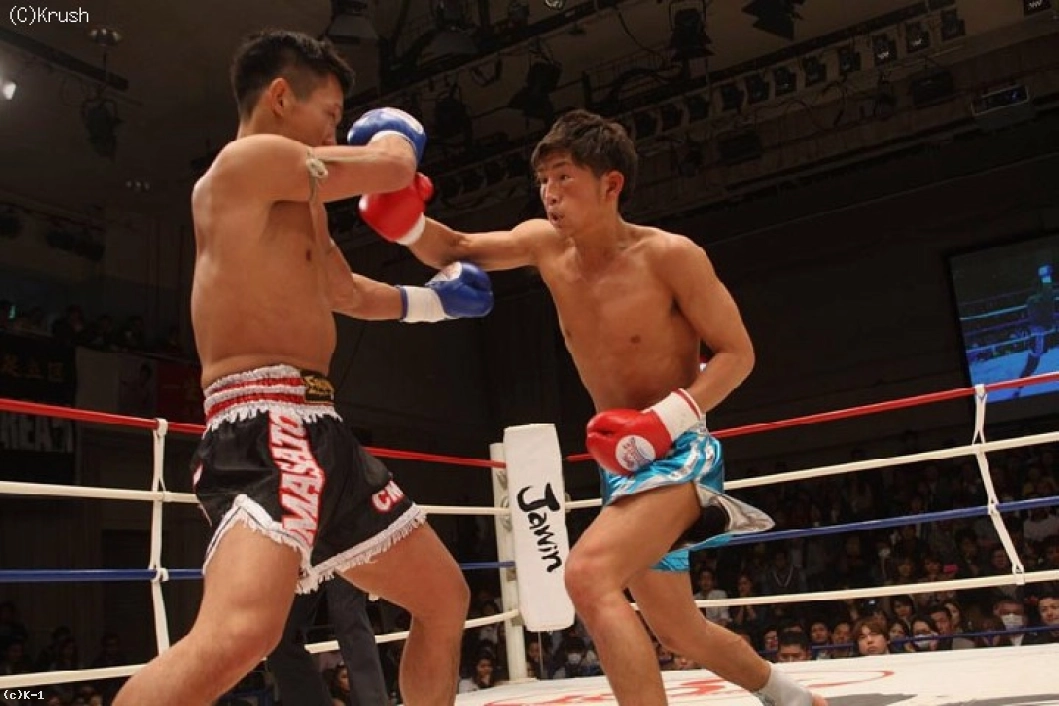 1R、ジャブとローで前に出る結城。匠はそこに右のヒザ蹴りのカウンター、結城の右ミドルをブロックして右ストレートを返す。さらに匠はパンチから左ミドル、キレのあるワンツーを叩き込む。
