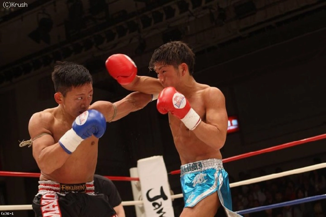 2R、匠が距離を取りながら左右のフック。結城もローを蹴って、右ストレートから前に出る。下がる匠に結城が右ハイキック。匠もワンツーと右のヒザ蹴りを返す。結城はそのヒザ蹴りにパンチを合わせ、匠を下がらせる。匠はワンツーから左フック、結城にロープを背負わせて右ストレート。タフな結城はすぐにパンチを打ち返して反撃する。