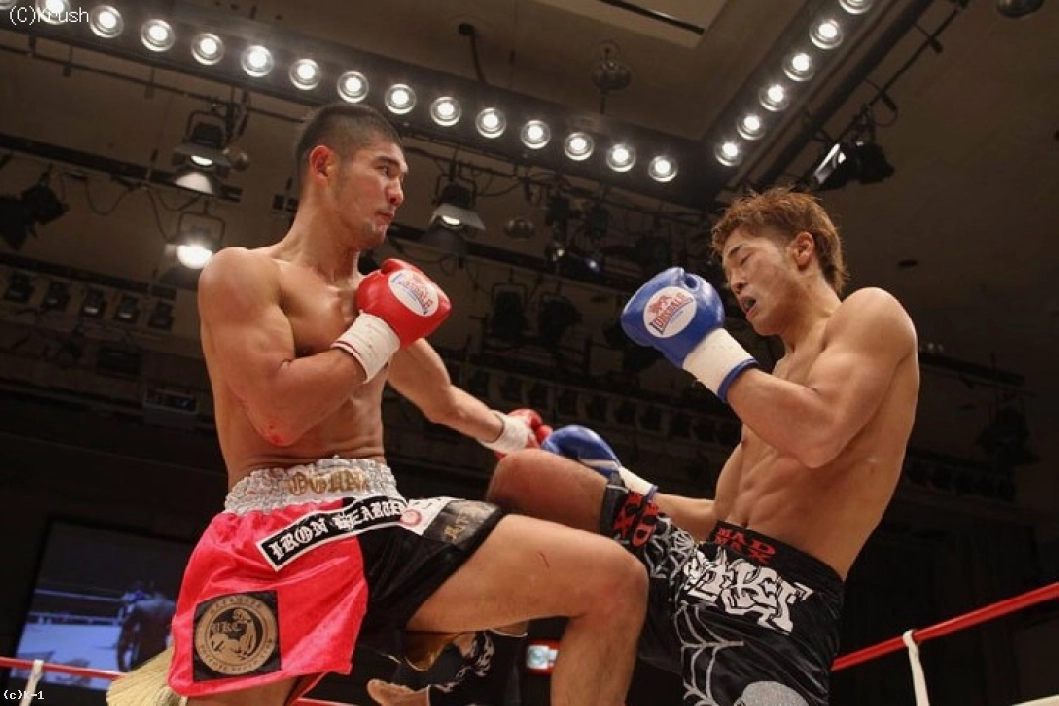 2R、東本は左ミドルを蹴って、左の前蹴り、左のヒザ蹴りでボディを狙う。顔面をガードして前に出る一輝だが、そこに東本は左ストレートと左のヒザ蹴り。距離が離れれば左ミドルと左の前蹴りで一輝を前に出させない。残り30秒、一輝が右のスイングフック。東本を足を使って距離を取り、左ストレートを返す。