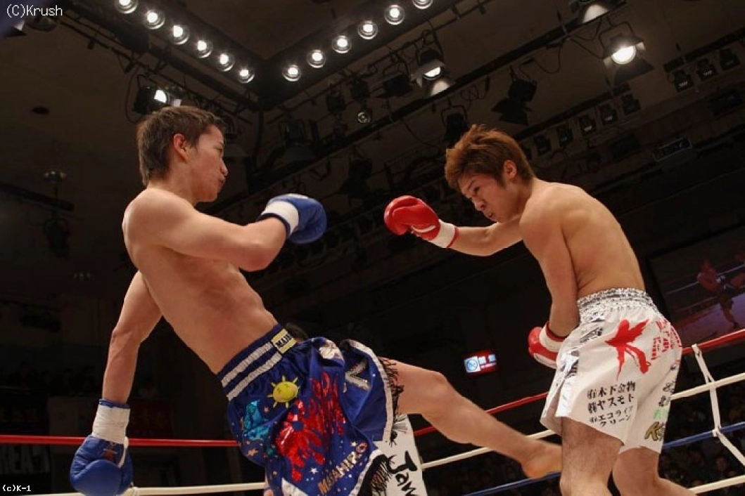 3R、一気にパンチで手数を増やしていく宮元。将大は前蹴りで距離を取ろうとするが、宮元は下がらない。左ボディ、左フックから右ストレートにつなげる宮元。顔面前蹴りから連打をまとめて、左フックから右ストレート。たまらず組みついてディフェンスする将大に、警告が与えられる。そのままタイムアップとなり、宮元が判定勝利ながら、Krush初陣を飾った。