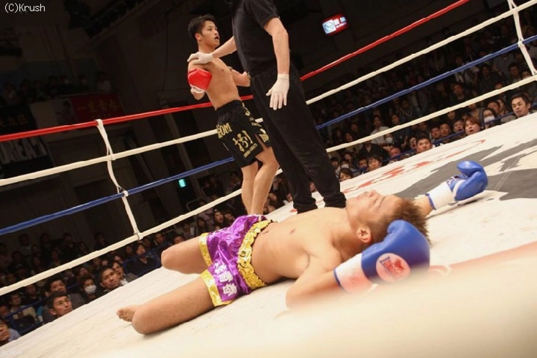ここでクリンチになり、レフェリーが両者にブレイクを命じるが、その直後に功也が右フック。これで大沢がばったりと倒れて、立ち上がることが出来ない。