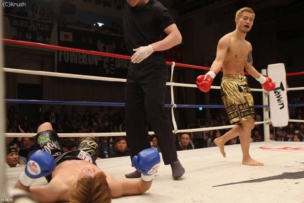 立ち上がった林は左ストレートから突進。竹内も右ストレートからパンチを返してヒザ蹴り。再び打ち合いになると、竹内が右ストレートを一閃。これで林をマットに沈め、狂拳爆発のKO勝利を収めた。