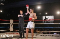 3R、戸邊は左ミドルと左ボディで鎌田の足を止めて、ロープを背負う鎌田に連打を打ち込む。そして粘る鎌田に戸邊はパンチから右ローを狙い撃ち。このローで2度のダウンを奪うと、レフェリーが試合ストップを宣告した。