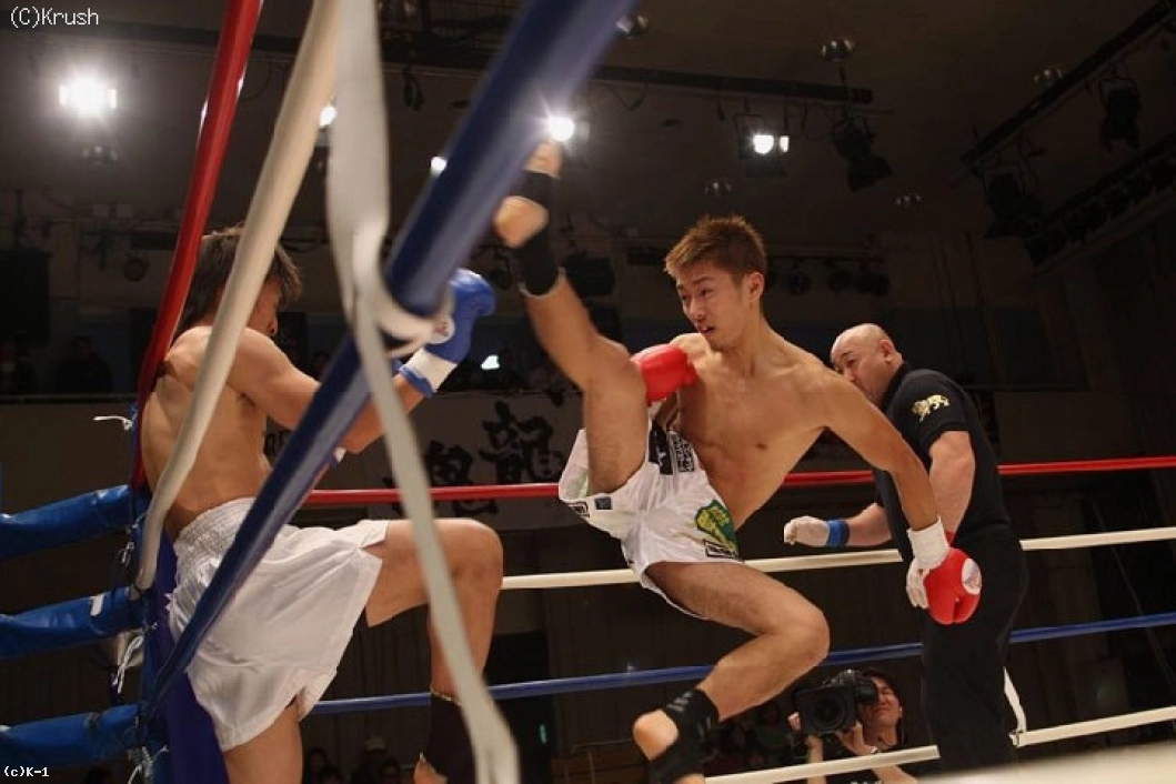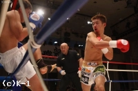 2R、伊澤が日畑のパンチをブロックして右ロー。これでプレッシャーをかけて日畑を攻め込んでいくが、ラウンド終了間際、日畑の左フックが伊澤の顔面を捉える。
