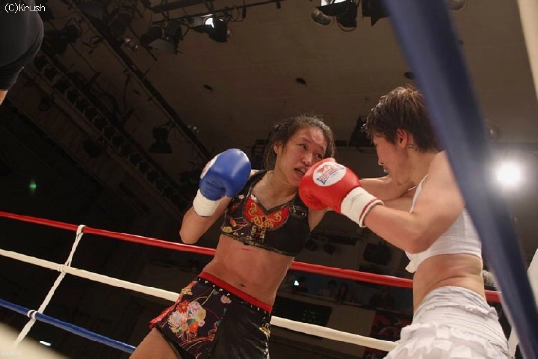 3R、林が左ミドルと右ストレート。朱里は距離を潰してヒザ蹴り、右ストレートにつなげる。徐々に朱里が林を下がらせる場面が増え、右ストレートとヒザ蹴り。林をコーナーに追いつめてパンチをまとめる。2R以降、手数と圧力で上回った朱里が無傷の4連勝を飾った。