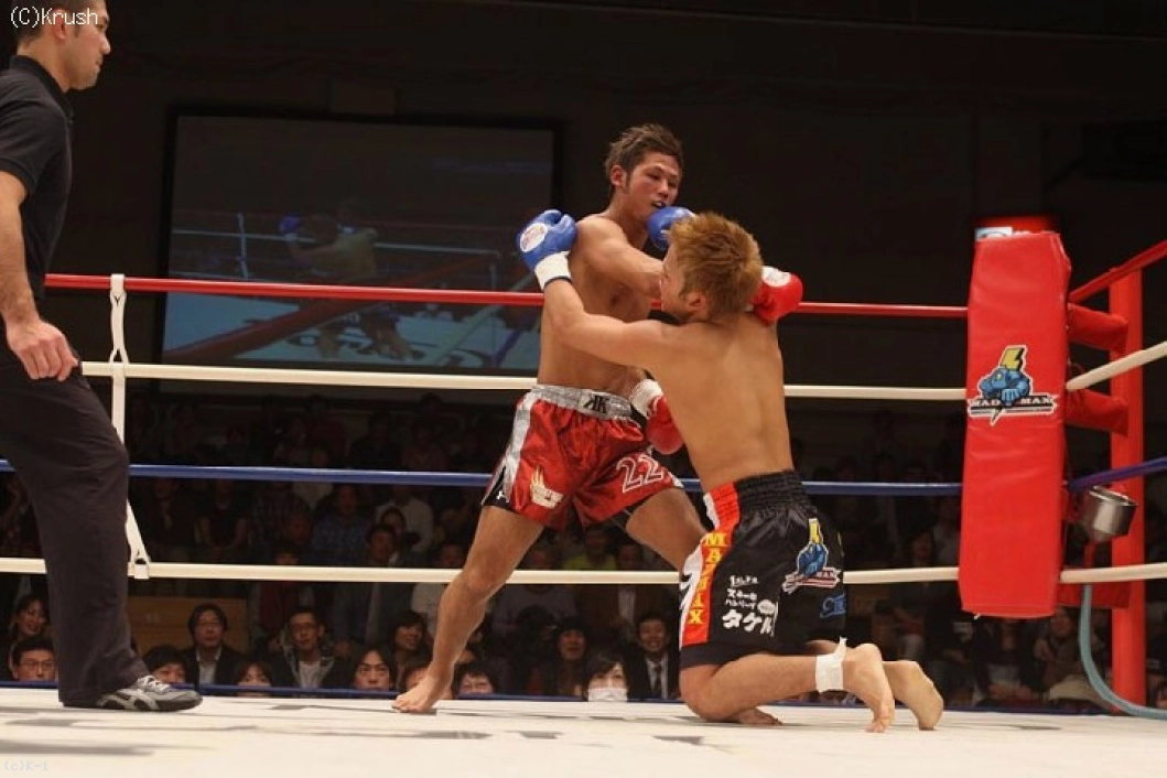 2R、築が右ストレートから前進。栗原は右ローを蹴っていく。築はそれに右ストレートを合わせて突進。ガードを固める栗原に連打をまとめる。しかし築の猛攻を凌いだ栗原が右ストレート、左フックで築の動きを止める。そしてバランスを崩した築に右ストレート。これで築からダウンを奪い、ダメージが大きな築を見てレフェリーが試合をストップ。栗原が見事なKO勝利を収めた。