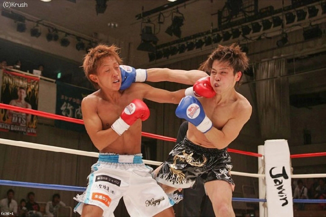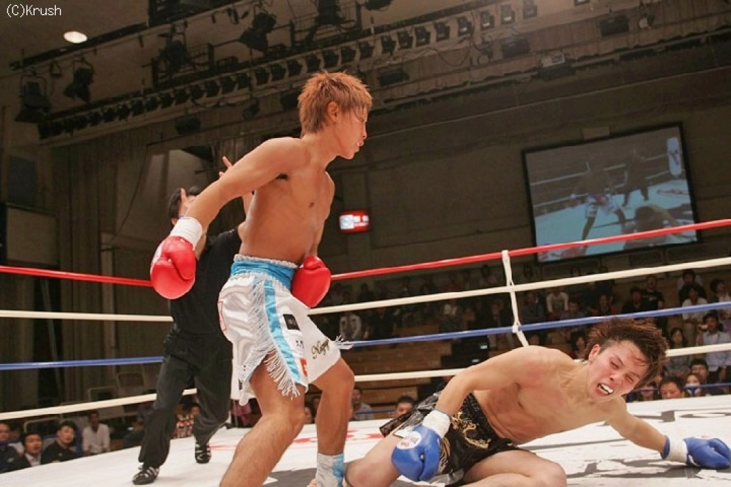 2R、ローを蹴って一気にパンチで手数を増やすkazyoshi。左フックで鎌田をぐらつかせて返しの右フック。これで鎌田からダウンを奪い、KO勝利を収めた。