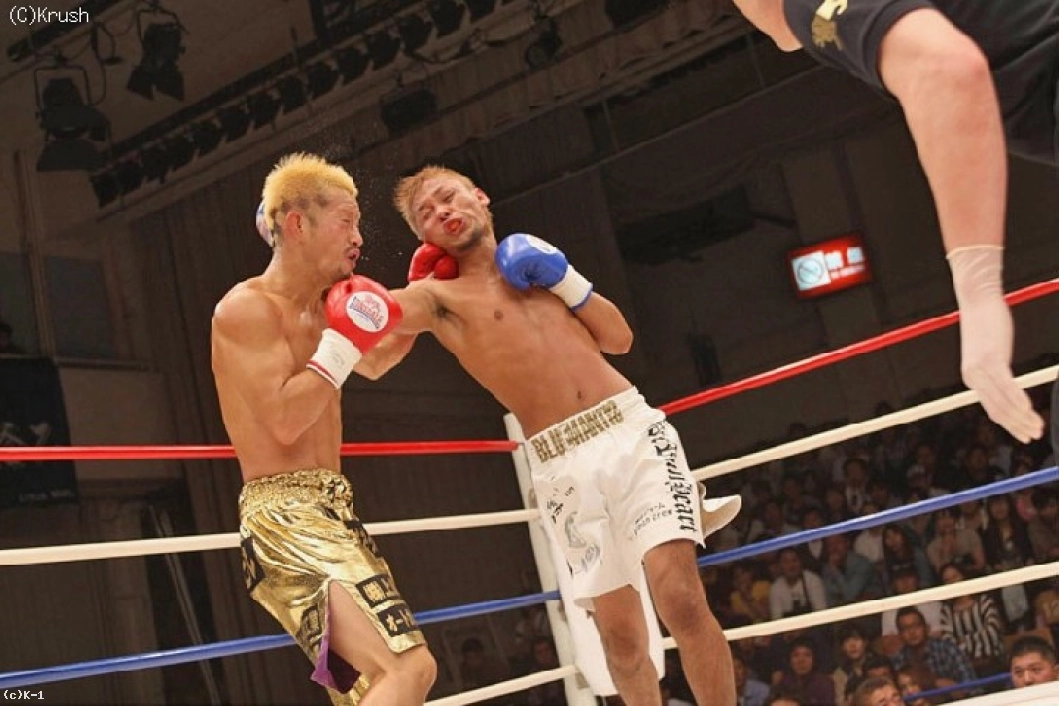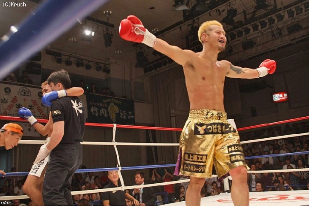 3R、大沢が右フックと左ボディ。竹内も右ストレートから左ボディを返す。竹内が左のヒザ蹴りで前に出ると、大沢は左ボディ。ここで竹内のヒザ蹴りがローブローとなり試合が一時中断となる。再開後、竹内は強烈なボディブローで大沢を下がらせて右ストレート! これで大沢が後方に吹っ飛びダウン! 立ち上がった大沢は右のヒザ蹴りで前に出るが、そこに竹内が左フック! ダウンを奪われた大沢は必死に立ち上がろうとしたが足元がおぼつかず、レフェリーが試合をストップ! 竹内が壮絶な殴り合いを制した。