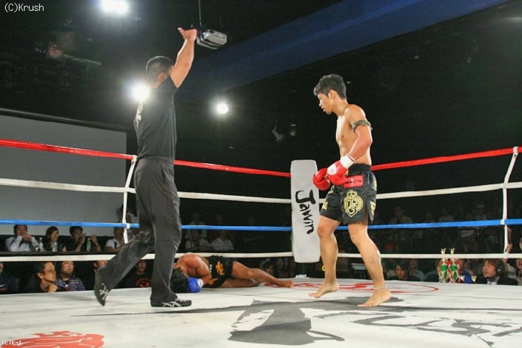 2R、園田の前蹴りをさばいてワンツーで飛び込む卜部。左ストレートを顔面とボディにつ打ち分けて、ボディに左ヒザ蹴り。園田がコーナーに詰まったところで顔面に左のヒザ蹴りを当てる。園田もパンチで前に出ようとするが、逆に卜部がボディにカウンターのヒザ蹴り! 卜部はこのヒザ蹴りを何発も園田のボディに突き差し、最後はボディへの左ストレート! これで園田が崩れ落ち、卜部がKO勝利で準決勝に駒を進めた。