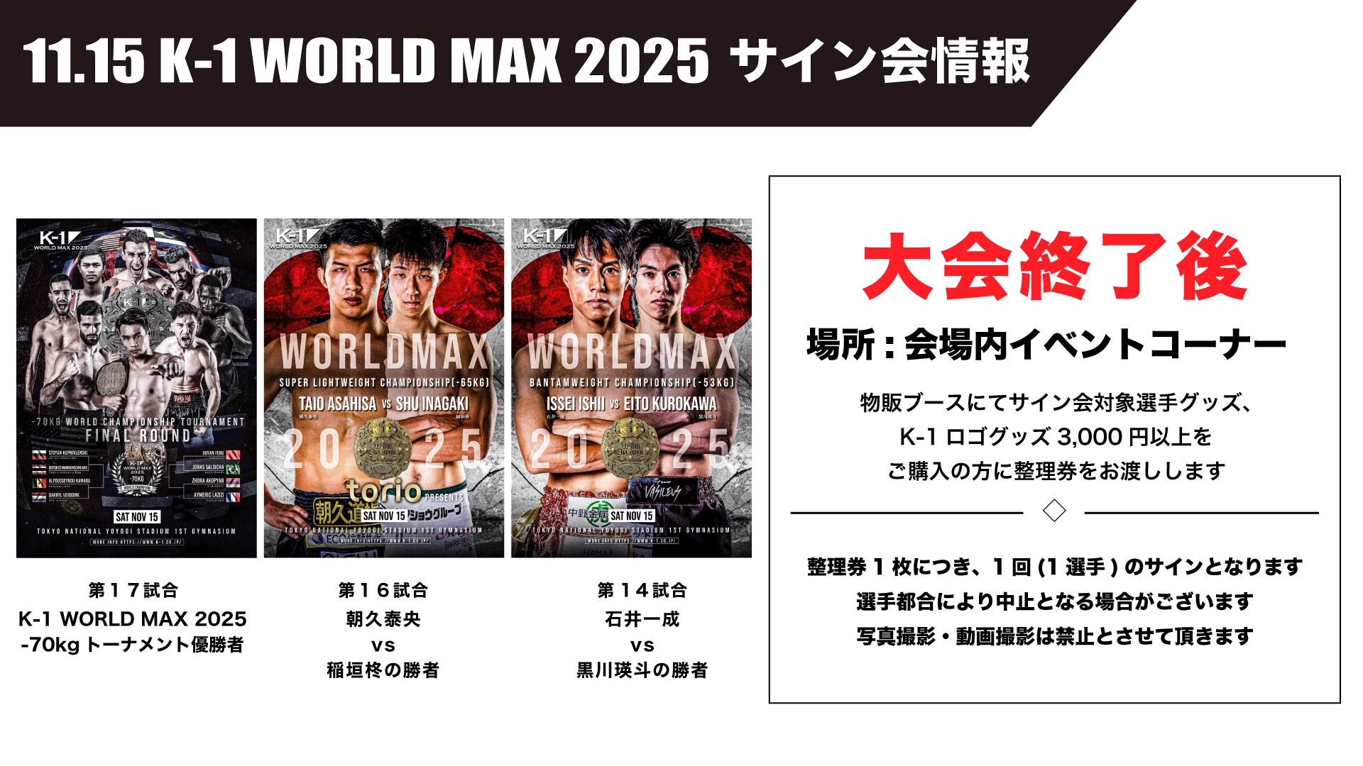 サイン会対象選手: ・第14試合/第2代K-1 WORLD GPバンタム級王座決定戦/3分3R・延長1R 石井一成 vs 黒川瑛斗の勝者 ・第16試合/【株式会社torio PRESENTS】第8代K-1 WORLD GPK-1スーパー・ライト級王座決定戦/3分3R・延長1R 朝久泰央 vs 稲垣柊の勝者 ・第17試合/K-1 WORLD MAX 2025 -70kgトーナメント・決勝戦/3分3R・延長1Rの勝者 ※参加選手は当日発表となります。