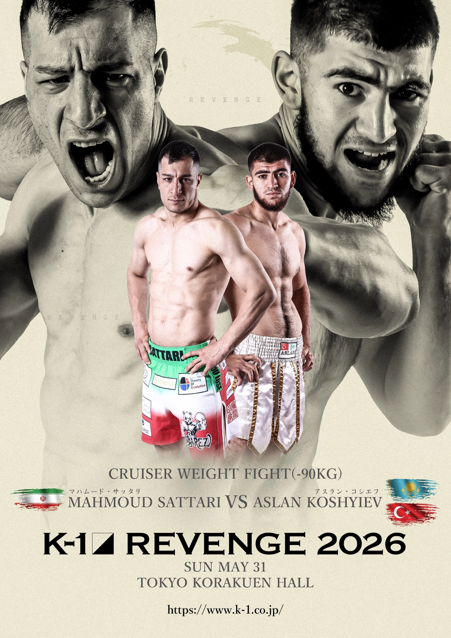 2026年5月31日(日)、東京・後楽園ホールで開催される『K-1 REVENGE』に参戦する“青い目のサムライ”マハムード・サッタリ(イラン/TEAM大和魂)の相手が、“カザフスタンの新星”アスラン・コシエフ(カザフスタン&トルコ/Fight Club TITAN)に決まった。