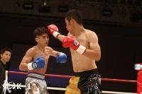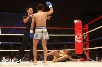 「(念願のKO勝利ですが?)やってる最中、早めに相手が眉上をカットしたんですけど、止まらなかったので、そこを狙って。あとは蹴りが得意な選手だったので、そこだけ警戒して、しっかり返せるように意識しました。(ダウンを奪った攻撃は狙いどおりですか?)まあ、狙いどおりですね。(試合後には涙も見られましたが?)バレましたか? ホントにうれしかったので。この舞台で勝つのは夢だったので。けっこう年もいってるんですけど、まだがんばれるというのを証明できたと思います。(ベルトへの興味は?)欲が出てくれば。やっぱり、一番の僕の目的は小比巻会長のもとで、会員さんたちに格闘技を教えているので、その技術がウソじゃないというのを証明できたので満足です。実戦で見せるのが一番説得力があると思うので、そういうふうにやっていければいいなと思います」