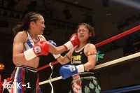 1R、朱里はトモコのローをカットしながら右ストレートで前進。トモコも左フックとローを返すが、朱里は距離が詰まるとヒザ蹴りを突き上げる。さらに朱里は左フック・右ストレートで手数を増やし、残り30秒、右ストレートの連打でスタンディングダウンを奪う。