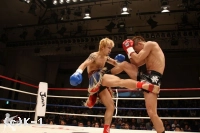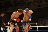 2R、気合いを入れてパンチで前に出る剣闘士だが、明戸が右フックを叩き込んでダウンを奪う。再開後、剣闘士は右ローとヒザ蹴りで猛攻。明戸をコーナーにくぎ付けにするが、明戸も左右のフックで譲らない。パンチ&ローで前に出る剣闘士。明戸は左ハイのカウンターを狙い、左フックをヒットさせる。