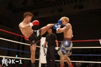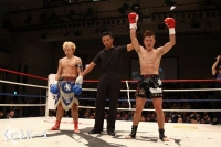 3R、パンチ、ロー、ヒザ蹴りで前に出る剣闘士。明戸は左フック・左ハイキックのカウンターを狙う。中盤、明戸の左ハイが当たり、剣闘士の動きが止まる。必死にパンチで前に出る剣闘士だが、明戸が左フックをヒットさせて下がらせる。残り30秒、足を止めて打ち合う両者。ここでも明戸が左フックで前に出る。判定は2Rにダウンを奪った明戸の勝利となった。