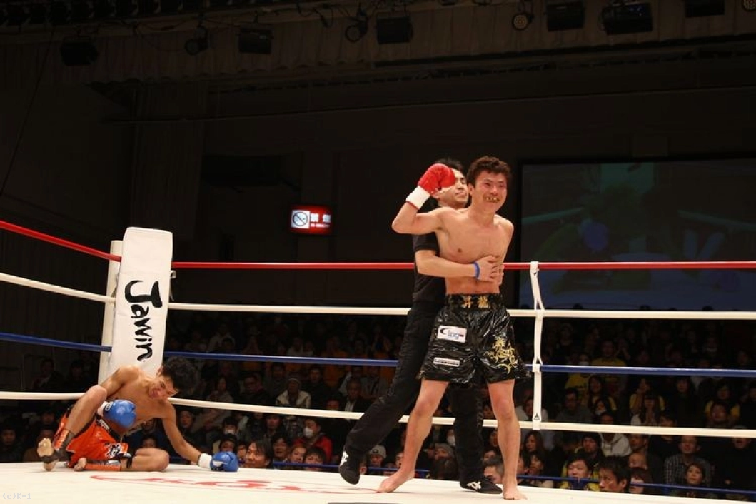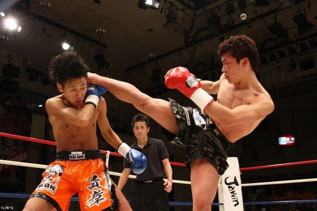 2R、右ローを連打する石田。右ハイキックやバックスピンキックを繰り出し、貴章がコーナーを背負ったところに強烈な左フック。この一発で貴章が崩れ落ち、石田が見事なKO勝利を収めた。
