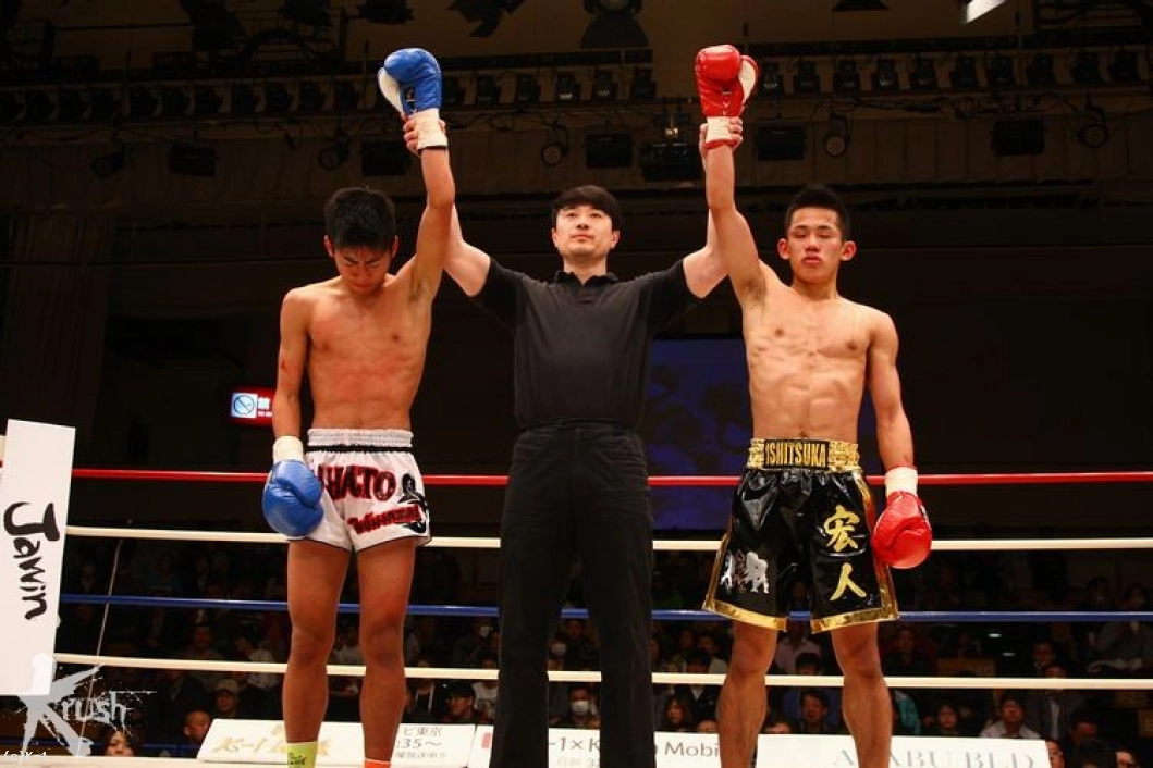 3R、石塚が右ストレートを当てれば、谷嶋も右ストレートを返して応戦。パンチ&ローで前に出る石塚。右ローを効かせて、一気に手数を増やすが、谷嶋も右アッパー・右フックを返して打ち合う。1Rに谷嶋がダウンを奪い、石塚が2・3Rに盛り返す形でドローに終わった。