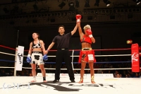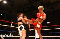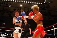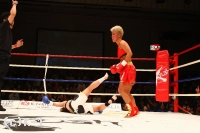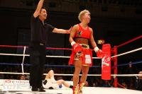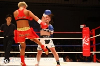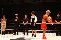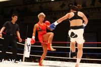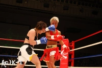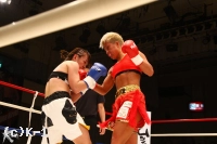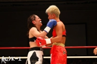 3R、紅絹はこのラウンドもヒット・アンド・アウェーを見せるが、KANAは下がったところをプレスして前に出る。そして近距離での打ち合いから右ショートストレート、右ハイキックをヒット。しかし打ち合いに戻ると紅絹が左ストレート、左フックを当て返す。だが、KANAも左フックをクリーンヒット。ローキックも紅絹の出足を止めている。KANAは前蹴りをボディ・顔面と打ち分け、右・左とパンチのヒット数を上げていく。左ボディフックを打ち込む紅絹だが、KANAは止まらない。左右フックから再度の顔面前蹴りを打ち込み、紅絹が前に来るとカウンターの左ハイキック。これで残り30秒のところでダウンを奪う。立ち上がった紅絹にKANAは右クロスから左ハイキックを見舞って終える。