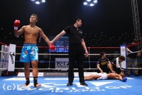 1R、開始から勢いよく出た剛王は、強振した右ストレートから返しで放った左ストレートを当てダウンを奪う。しかしその後は神保がジャブ、ローで出足を止め、剛王を懐に入れさせない。
