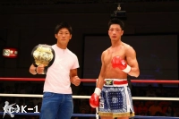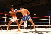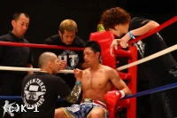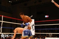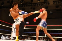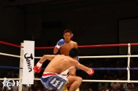 2R、ダウンを先取した平山は攻勢を強め、強烈な右ローを塚越に打ち込む。だが、身長で上回る塚越がやがて平山をロープに詰めていく展開に。右ストレート、左フックと追っていく塚越は左フックを決め、これで平山を後方にヨロめかせる。そしてさらにロープ際へ追い、今度は左フックで打ち抜くと平山はバッタリと倒れ、立ち上がることできず塚越の逆転KOとなった。