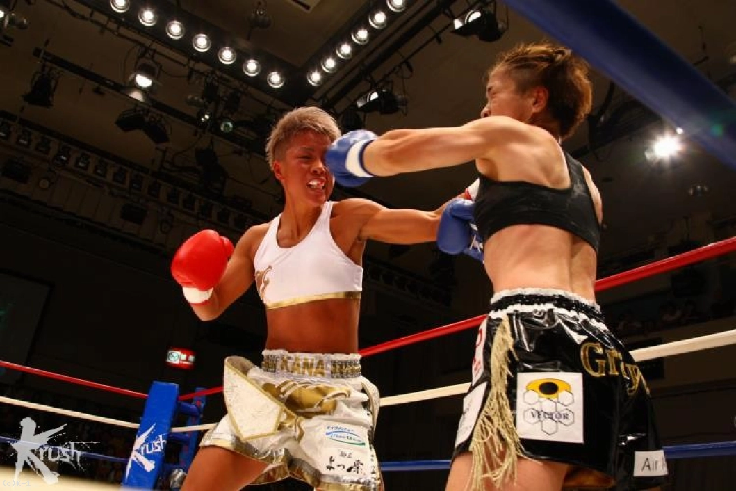 2R、KANAが圧力を発して襲い掛かるが、グレイシャアも打ち合いの中でインサイドからの右ストレートでとらえる。続いて右アッパー。グレイシャアが出てくるとKANAはステップバックして踏み込んでくるその足に右ローをヒット。右ボディブロー、右ローと巧み試合運びを見せるKANA。しかしグレイシャアも左ボディから右ローを打ち込みまだ均衡は破られず保たれたまま。KANAは後ろ回し蹴り、右アッパーと攻撃がワンパターンにならない。前回紅絹からダウンを奪った左ハイも見せる。グレイシャアはボディへのヒザを見せるが、KANAは右クロス、右ロー、右フック、そしてバックブローと攻撃をまとめる。だが、グレイシャアはこれに下がらず、逆に前に出てKANAを押していく。そしてヒザとボディフックでボディを効かせ、右ストレートもKANAに浴びせていく。