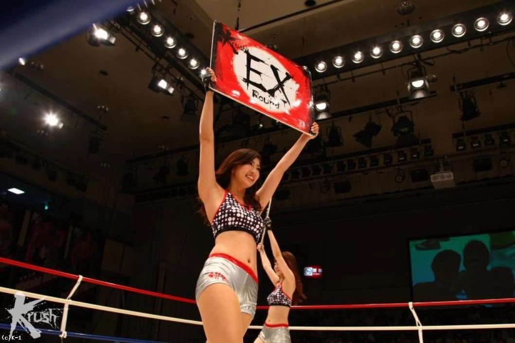 EXR、意気込みを見せ前に出る原田のミドルとローを大沢はかわし当てさせない。距離を作って原田に打たせ、逆にこれをかわして大沢は右ストレートを巧打する。原田はこの右ストレートを受け一瞬のけぞるが、すぐにまた連打に入る。しかし大沢は再びカウンターの右ストレートをヒット。両者打ち合うもクリーンヒットは得られず終了となる。ゴングが鳴ると両手を広げた大沢に対しうなだれた原田と両者の様子は分かれる。