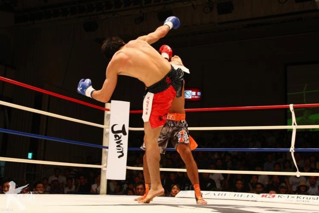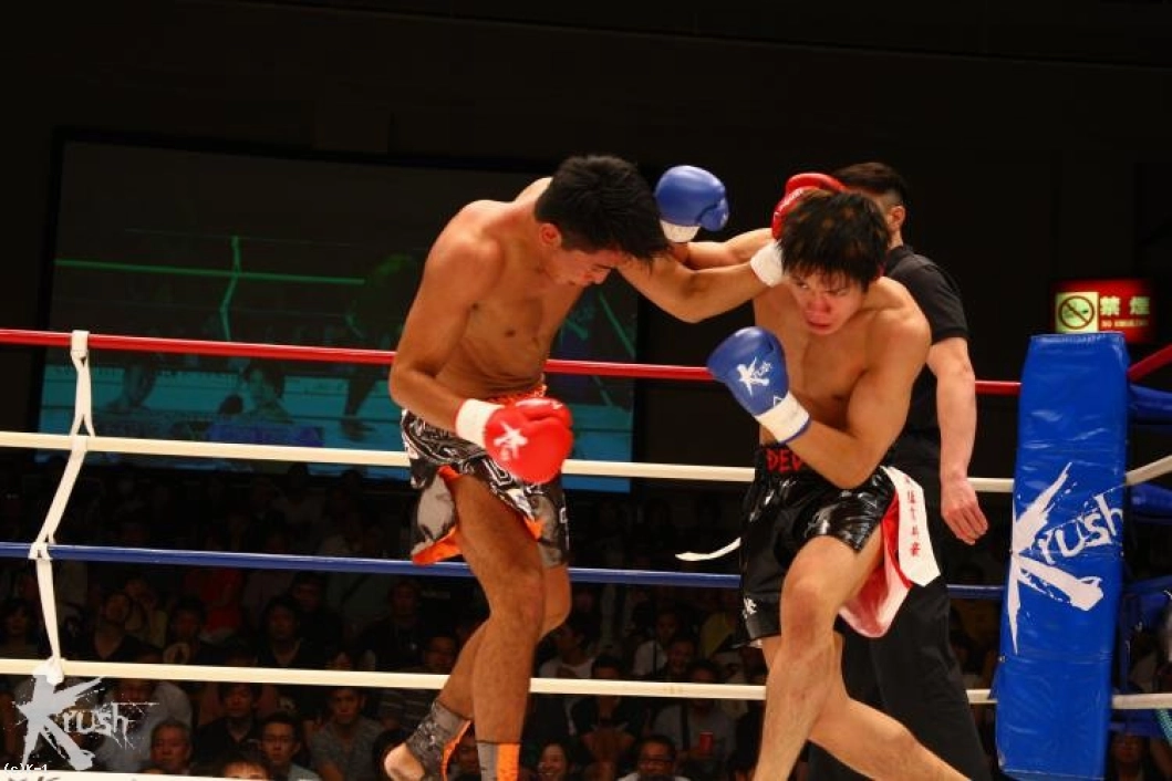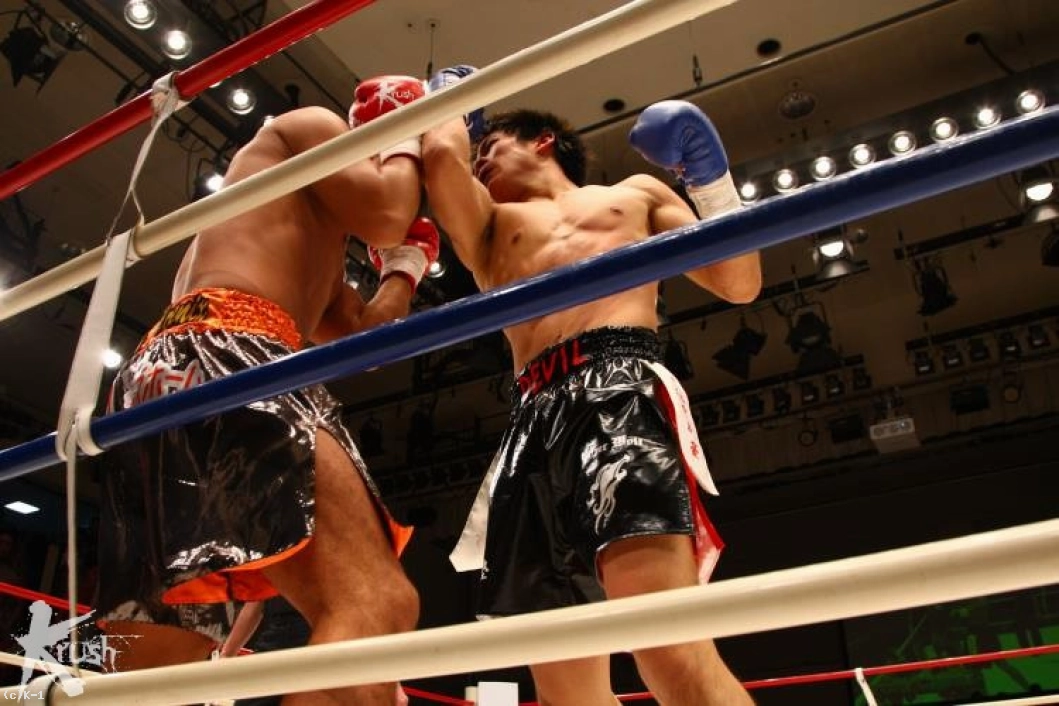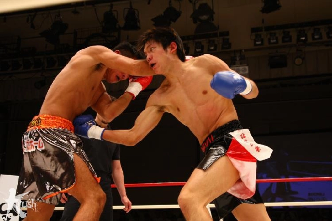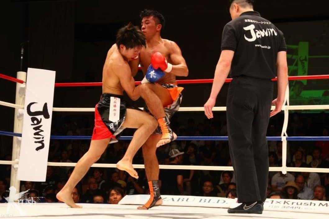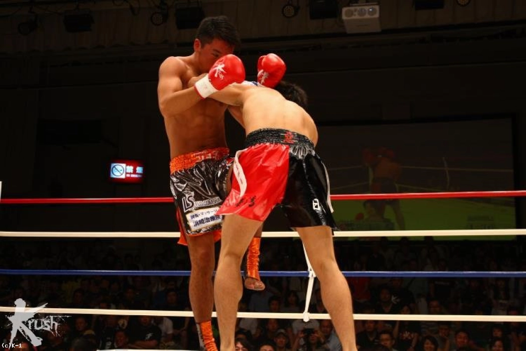 サウスポーの廣野にオーソドックスの秋元。秋元は左フックからボディへのヒザ、さらに跳びヒザ。勢いのある秋元だがしかし廣野はこれに動揺せず、秋元を押し返して左インロー、ボディアッパーと入れる。だが秋元は前に出る勢いを落とさない。廣野もボディに左ヒザを入れて応戦する。両者押し合いの展開となり、フィジカル合戦の様相を呈する。